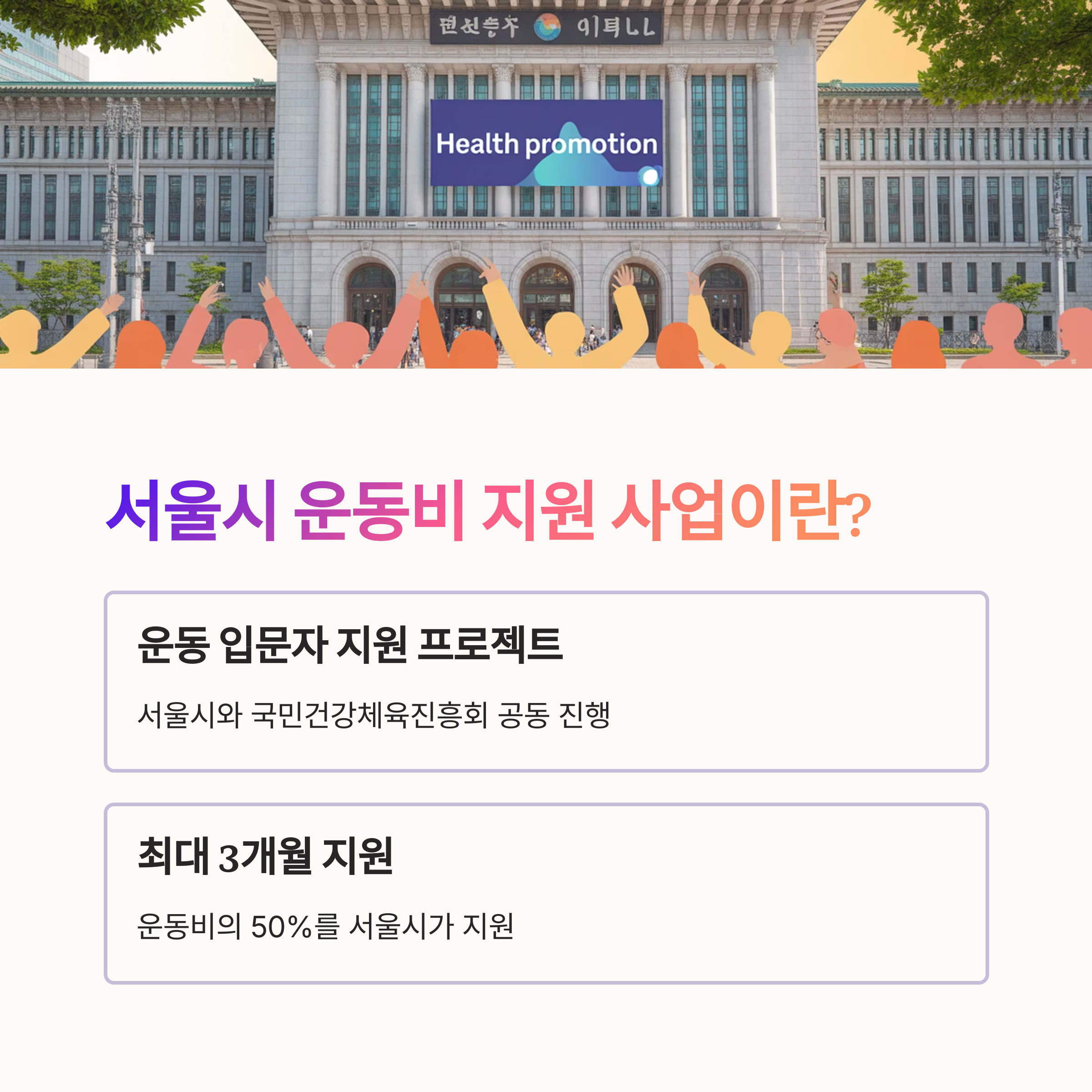 서울시와 국민건강체육진흥회가 협업하여 만든 ‘운동 입문자 지원 프로젝트’는 운동을 시작하려는 시민들에게 최대 3개월간 수강료의 50%를 지원하는 제도예요.