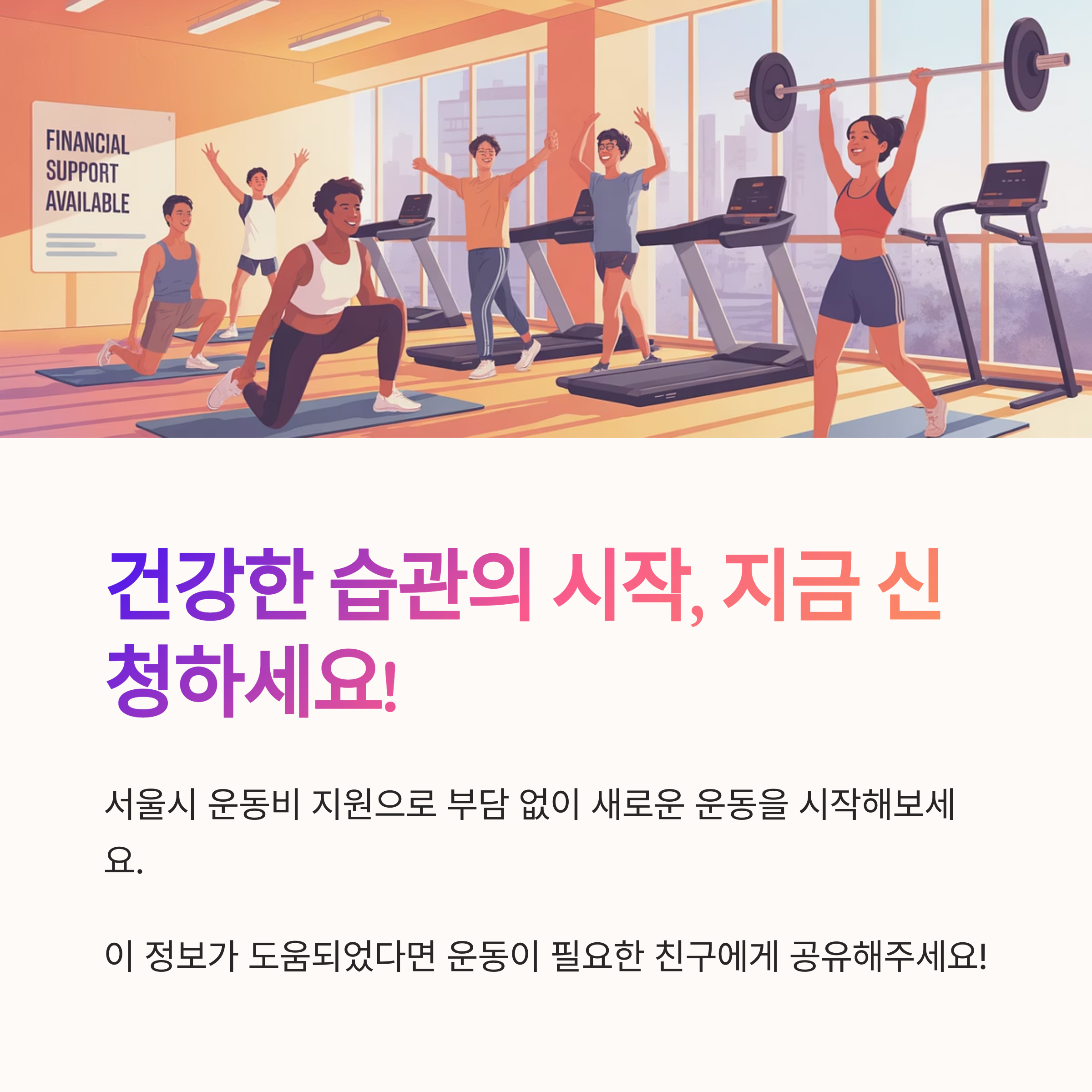 서울시에서 운동비 절반을 지원해주는 운동 입문자 복지 프로그램! 헬스, 요가, 복싱 등 다양한 종목 가능하며 선착순 모집. 신청 방법, 대상 조건, 등록 절차까지 쉽게 정리해드립니다.