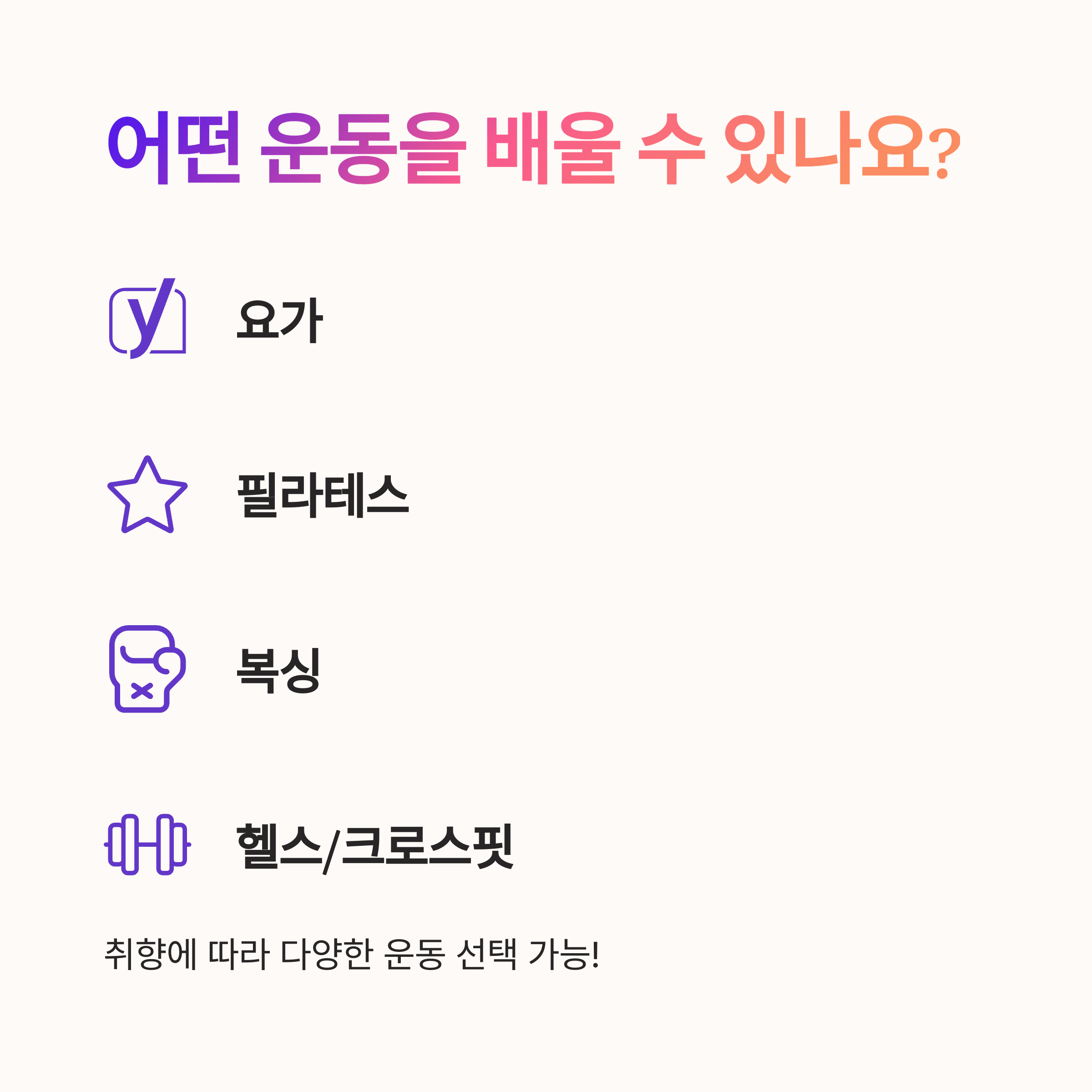 - 실내 사이클, 댄스, 체형 교정 등