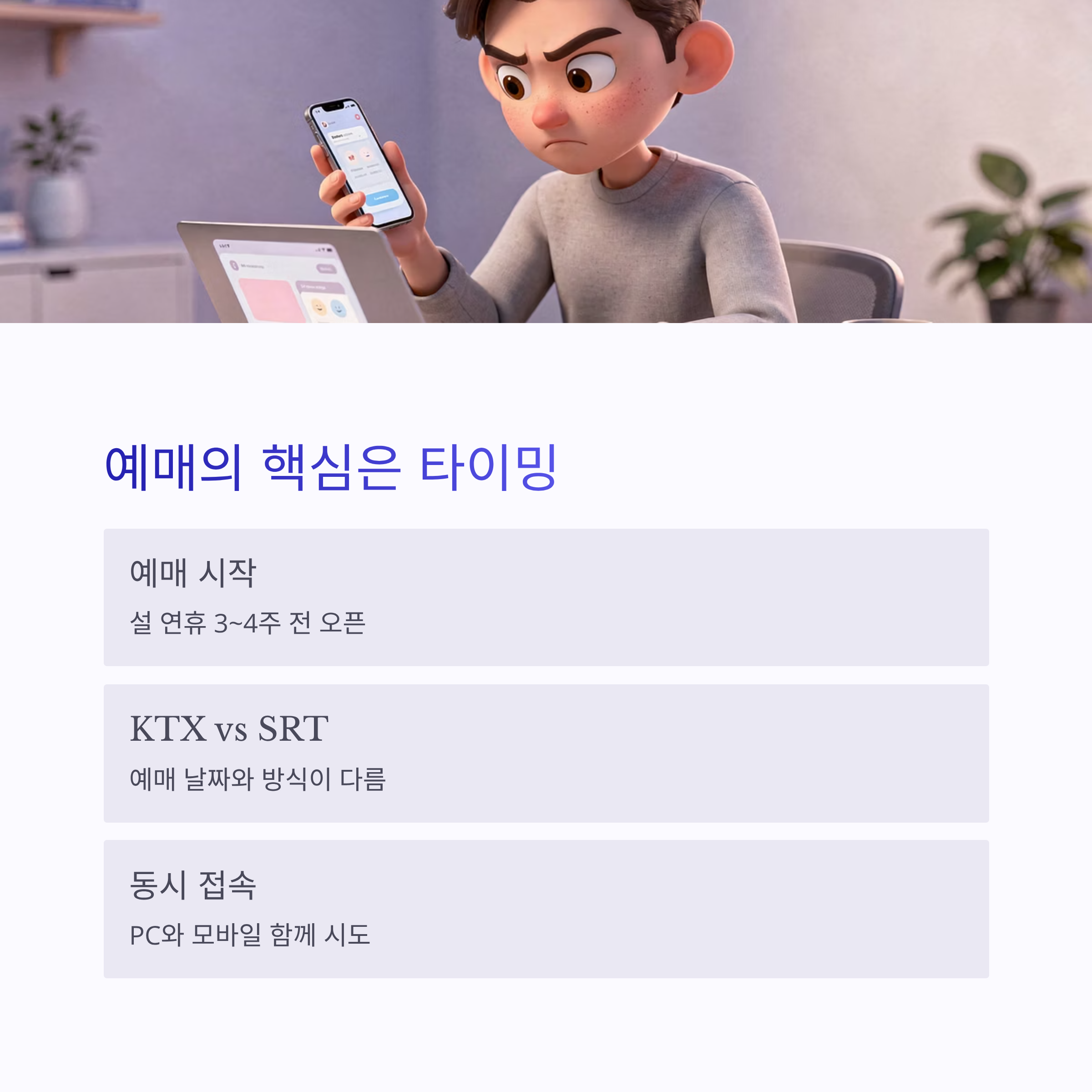 설 기차표 예매 방법에서 가장 중요한 건 일정 체크입니다. 보통 설 연휴 3~4주 전에 예매가 열리고, 코레일 KTX와 **SR SRT는 날짜가 다릅니다. KTX는 노선별로 날짜를 나눠 예매하고, SRT는 비교적 단순하지만 경쟁은 더 빡센 느낌이었어요. 저는 2025년 설 때 모바일로만 도전했다가 실패해서, 2026년엔 PC+모바일 동시에 들어갔습니다. 이게 진짜 차이 나더라구요. 설 기차표 예매 방법은 ‘속도’보다 ‘동시 접속 전략’이 핵심이었습니다 ㅎㅎ