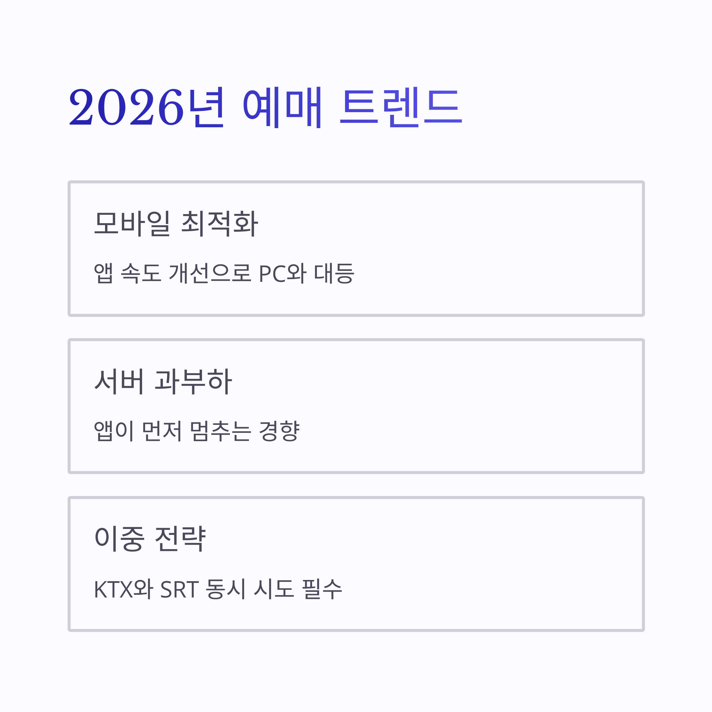 2026년 기준으로 느낀 점은 모바일 비중이 훨씬 커졌다는 겁니다. 예전엔 PC가 유리했는데, 요즘은 앱 최적화가 잘 돼서 모바일도 충분히 빠르더라구요. 다만 단점도 있어요. 서버 터질 때는 앱이 먼저 멈춥니다 ㅠㅠ KTX는 좌석 선택 자유도가 좋고, SRT는 시간대 선택이 직관적인 장점이 있었습니다. 반대로 KTX는 경쟁이 분산되고, SRT는 특정 시간대에 쏠리는 단점도 있었구요. 상황 따라 둘 다 열어두는 게 설 기차표 예매 방법에서 가장 현실적인 선택이었어요.