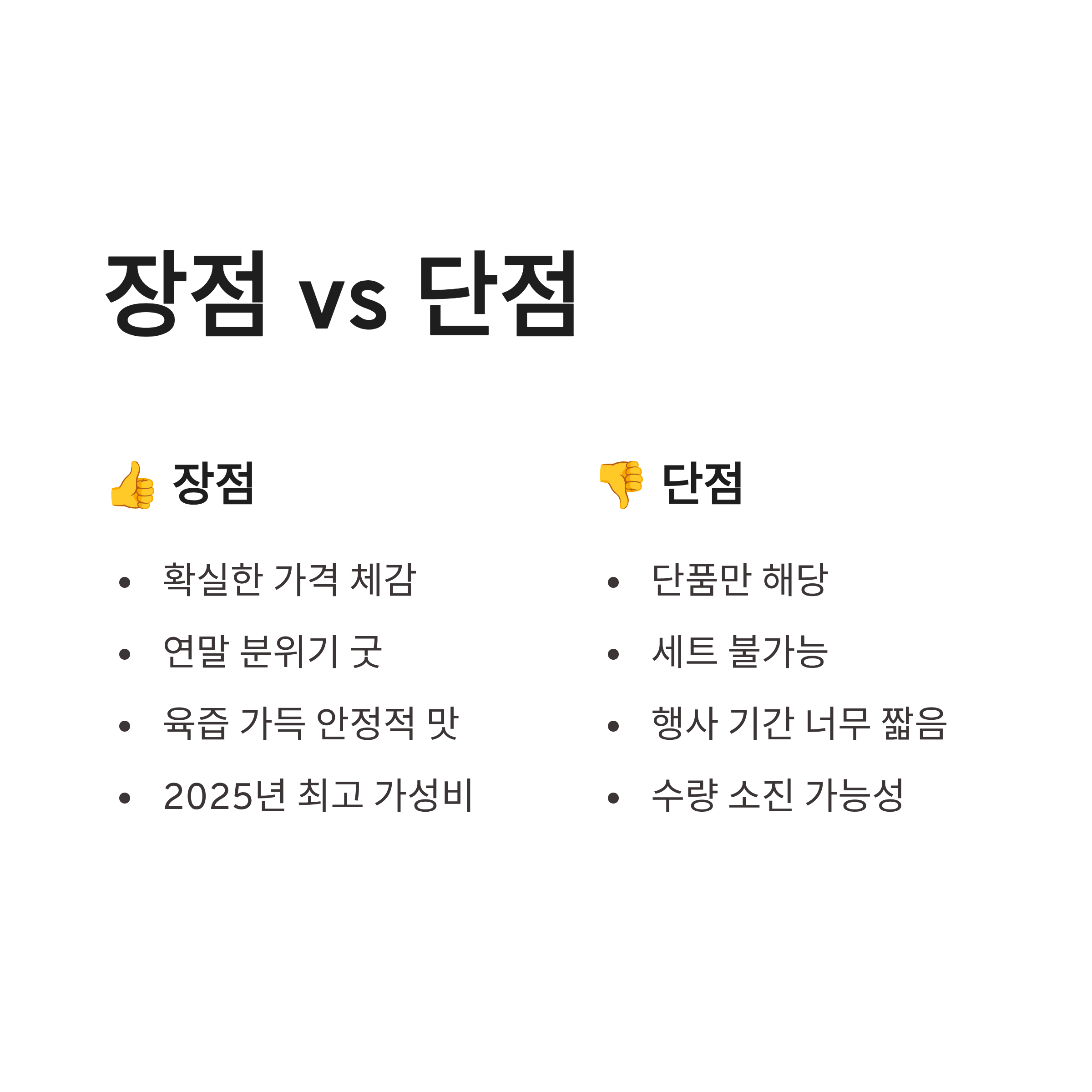 요즘 2025년 외식 물가 생각하면, 이 정도 가성비 이벤트가 흔하진 않아요. 장점부터 말하면, 가격 체감이 확실하고 연말 분위기랑 잘 어울립니다. 쉑버거 특유의 육즙이랑 번 조합은 여전히 안정적이구요. 반대로 단점이라면, 단품만 해당이라 세트 기대하셨던 분들은 살짝 아쉬울 수 있어요. 그리고 행사 기간이 너무 짧음… 진짜 짧아요 ㅠㅠ 그래도 전체적으로 보면, 쉑버거 1+1 행사는 2025년 연말 이벤트 중에서는 꽤 잘 만든 편이라는 느낌이었습니다.