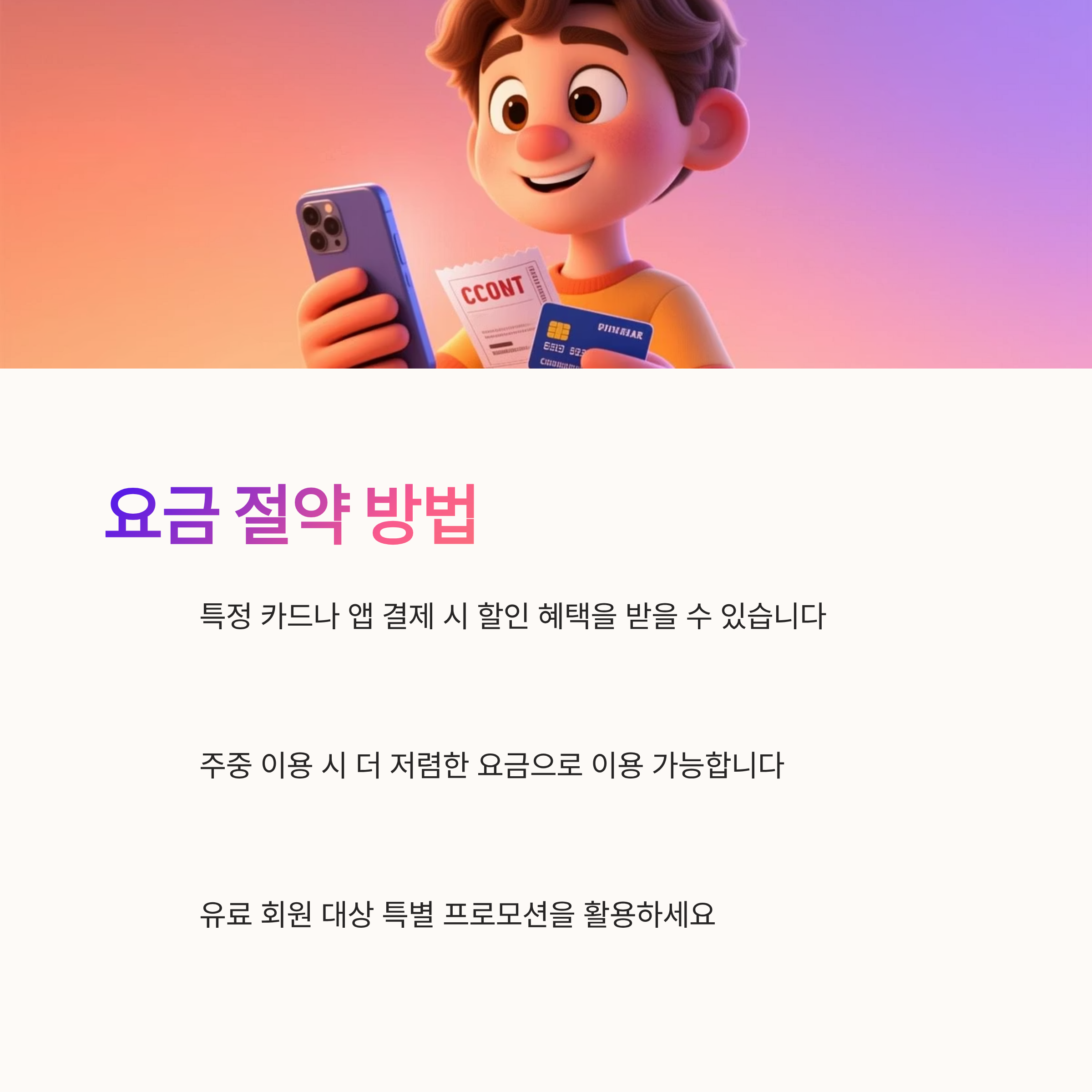 절약은 언제나 기분 좋은 일이죠. 할인 혜택을 놓치지 마세요! 특정 카드나 앱을 통한 결제 시 할인을 받을 수 있으니까요! 그리고 주중에는 가끔씩 유료 회원을 대상으로 특별 프로모션도 있으니까 앱에서 알림을 켜두는 것도 좋은 방법입니다. 알뜰하게 이용할 수 있다니 너무 좋아요 그쵸? 🙂