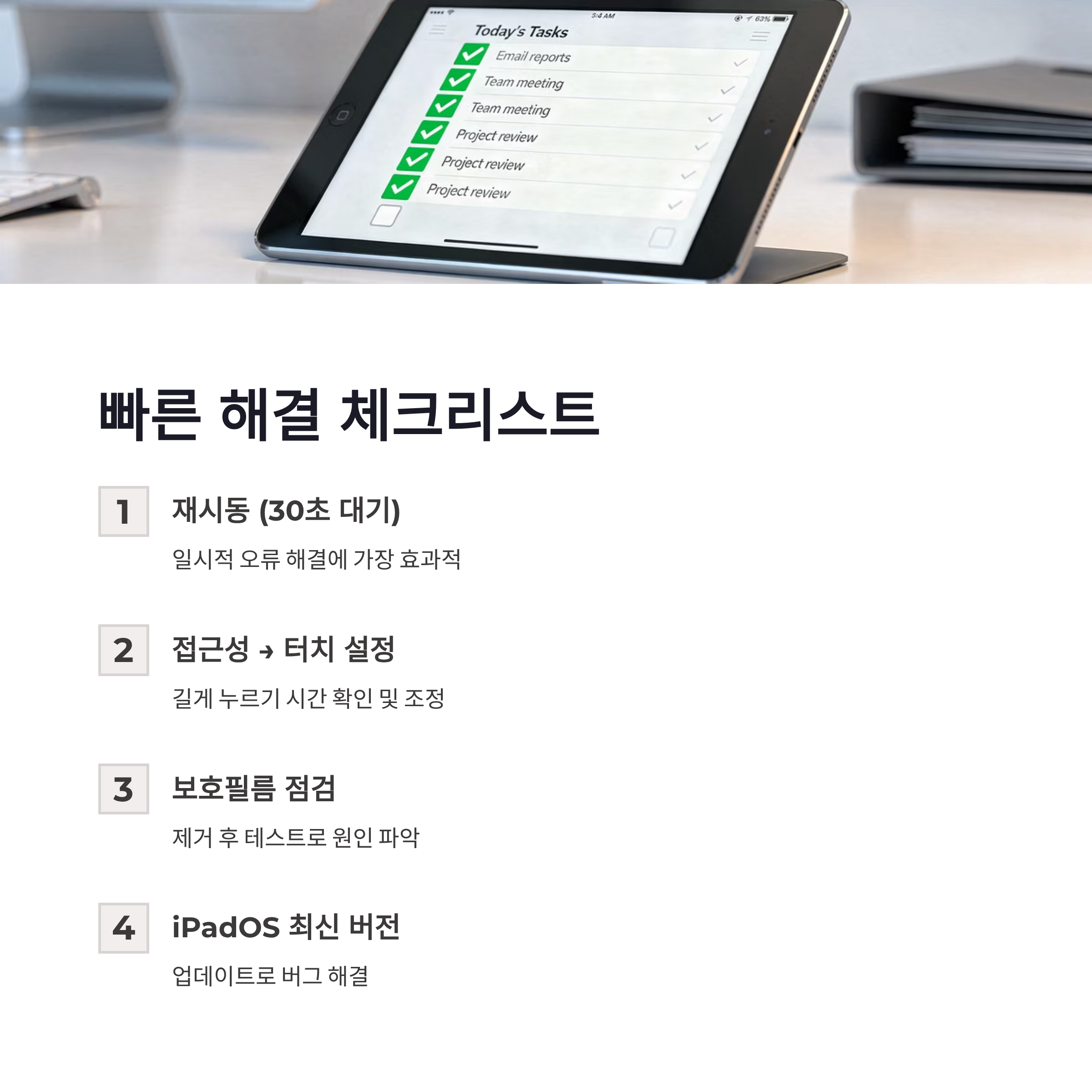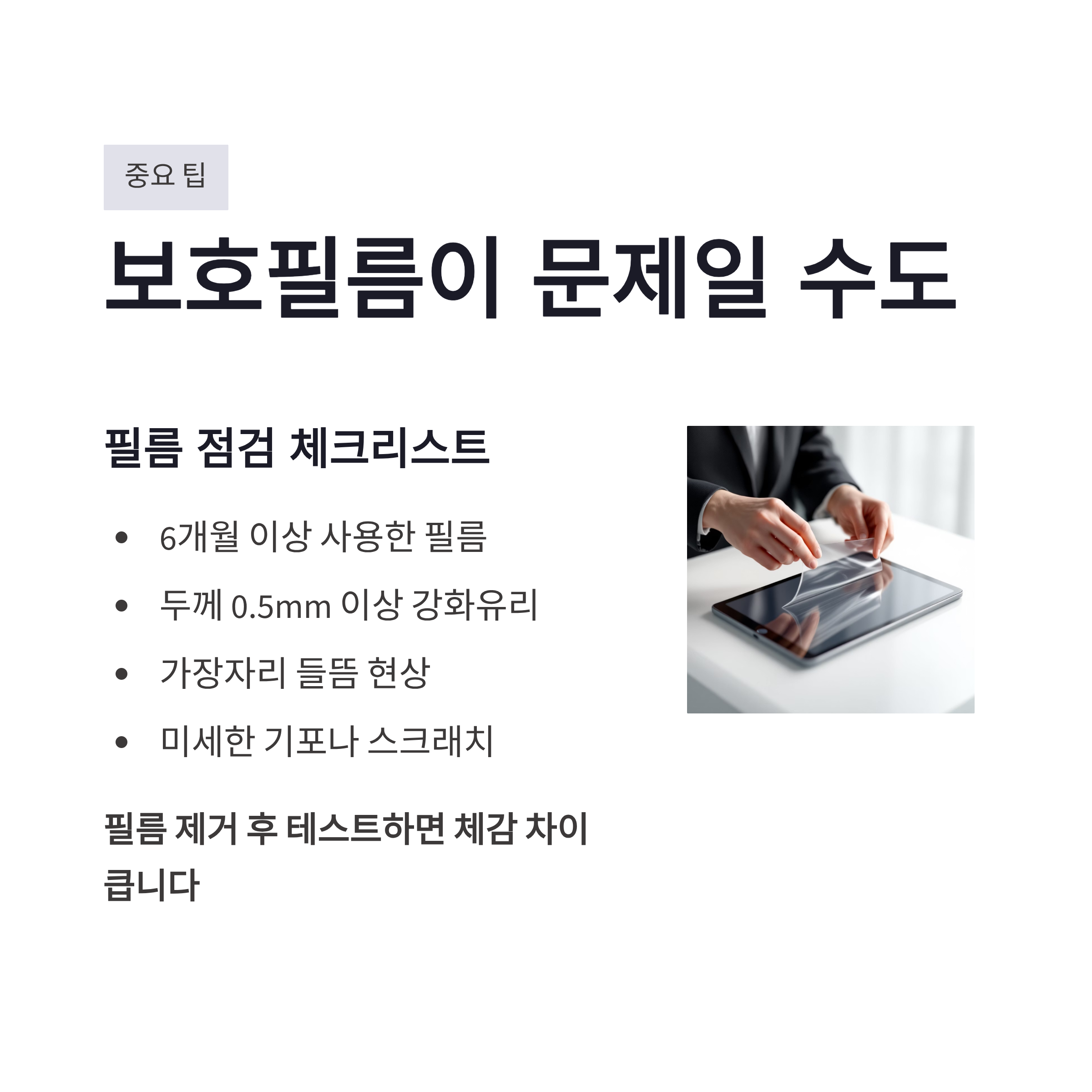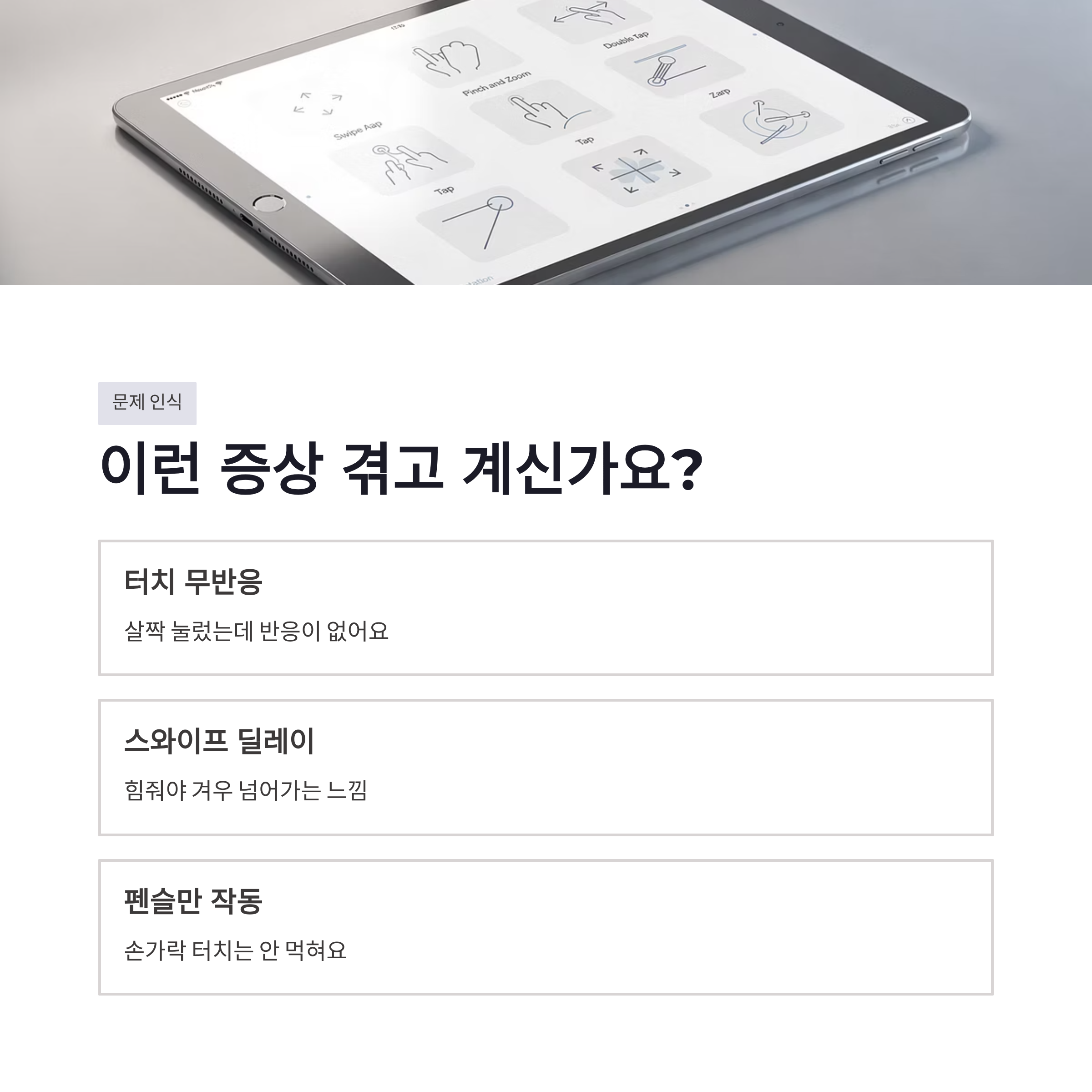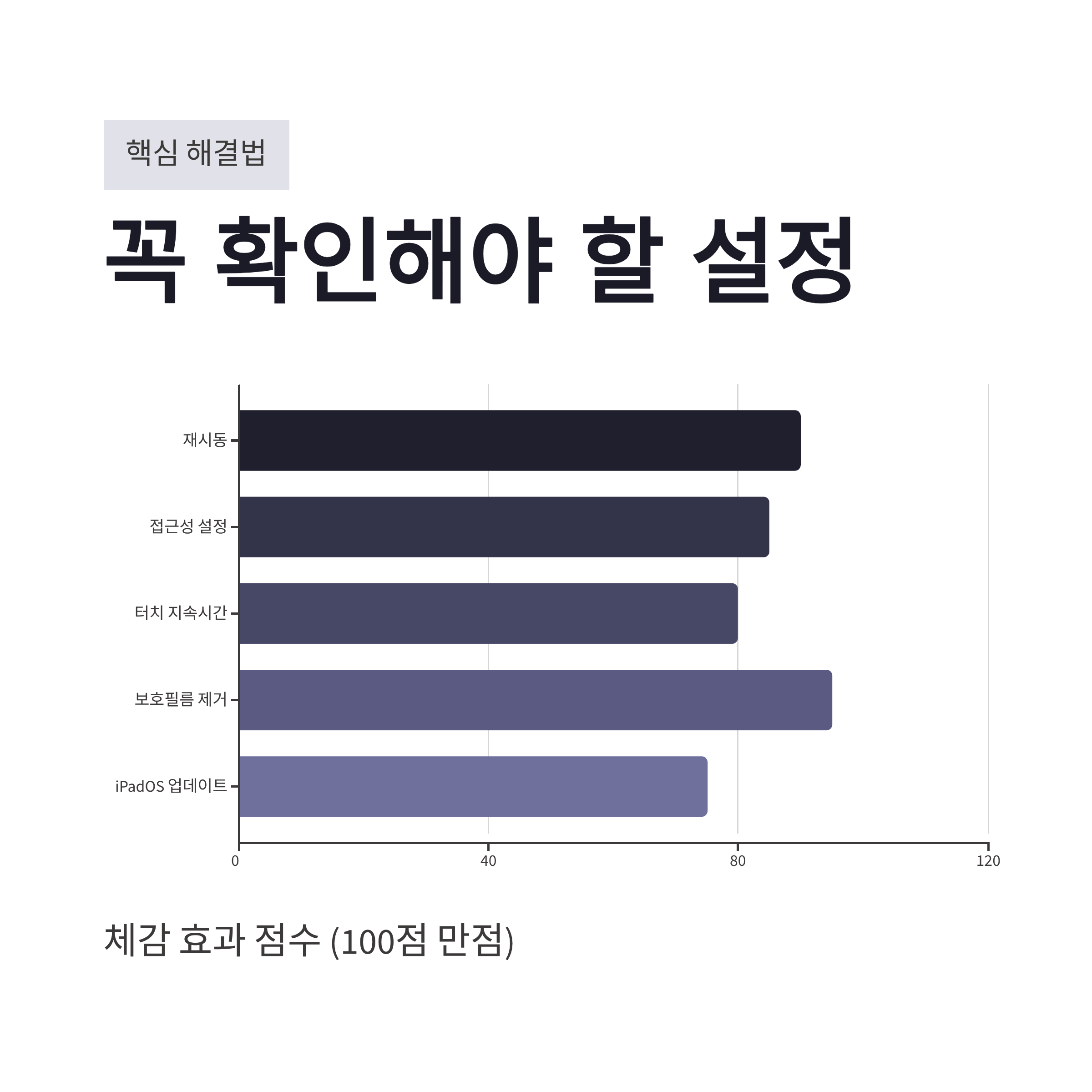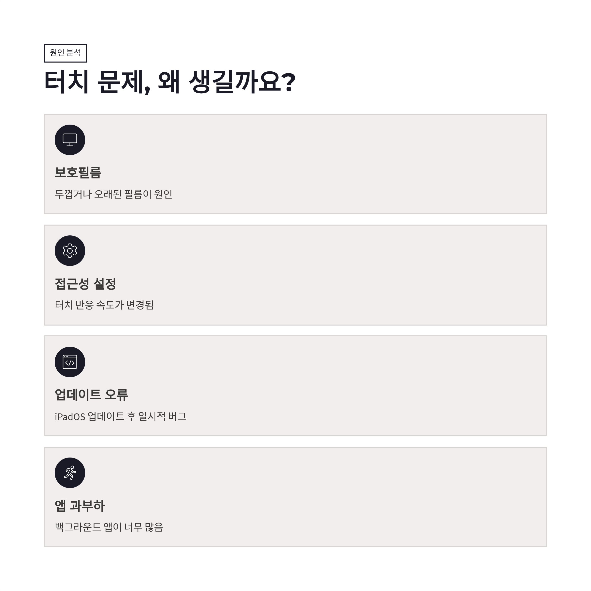 * 화면 보호필름이 두껍거나 오래됨 * 접근성 설정에서 터치 반응 속도 변경됨 * iPadOS 업데이트 후 일시적 오류 * 백그라운드 앱 과부하 * 정전기, 손이 너무 건조할 때도 영향 있음(이건 진짜임…)