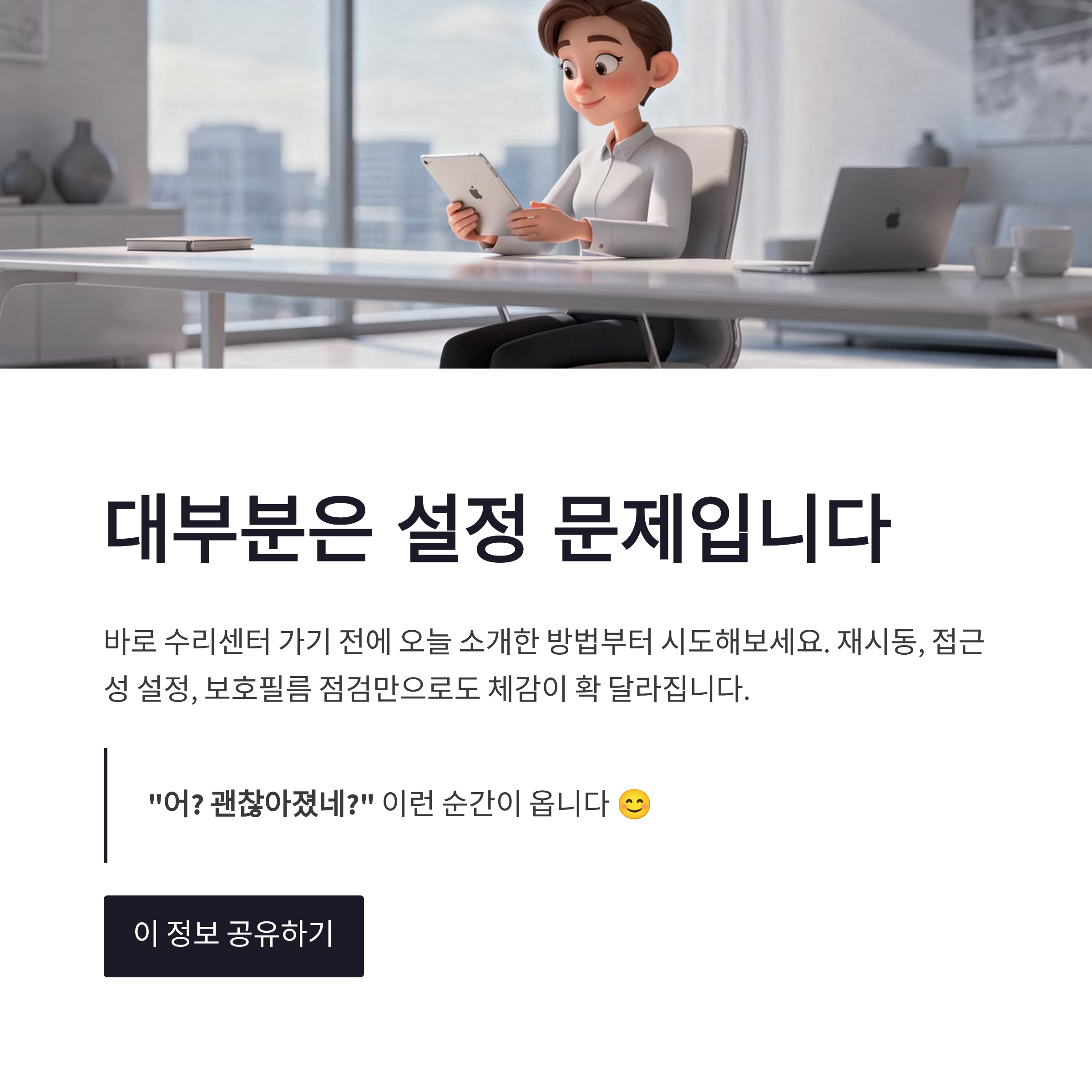 정리해보면요. 아이패드 터치 인식 문제가 있다고 해서 바로 고장이다! 이렇게 생각할 필요는 거의 없었어요. 재시동 한 번, 접근성 설정 확인, 보호필름 점검만 해도 체감이 확 달라지는 경우가 많더라구요. 저도 그랬구요 ㅎㅎ