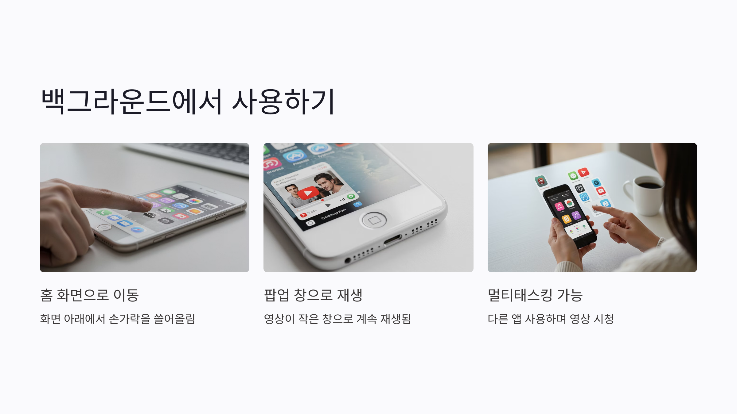 - 유튜브 영상은 작은 팝업 창으로 계속 재생!