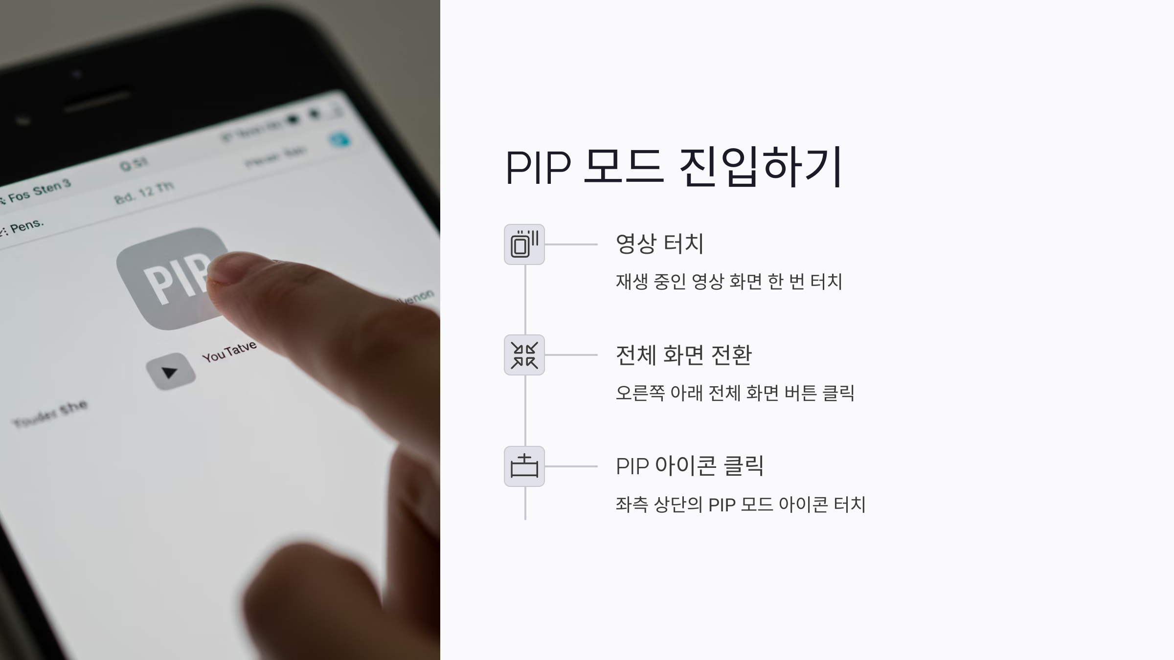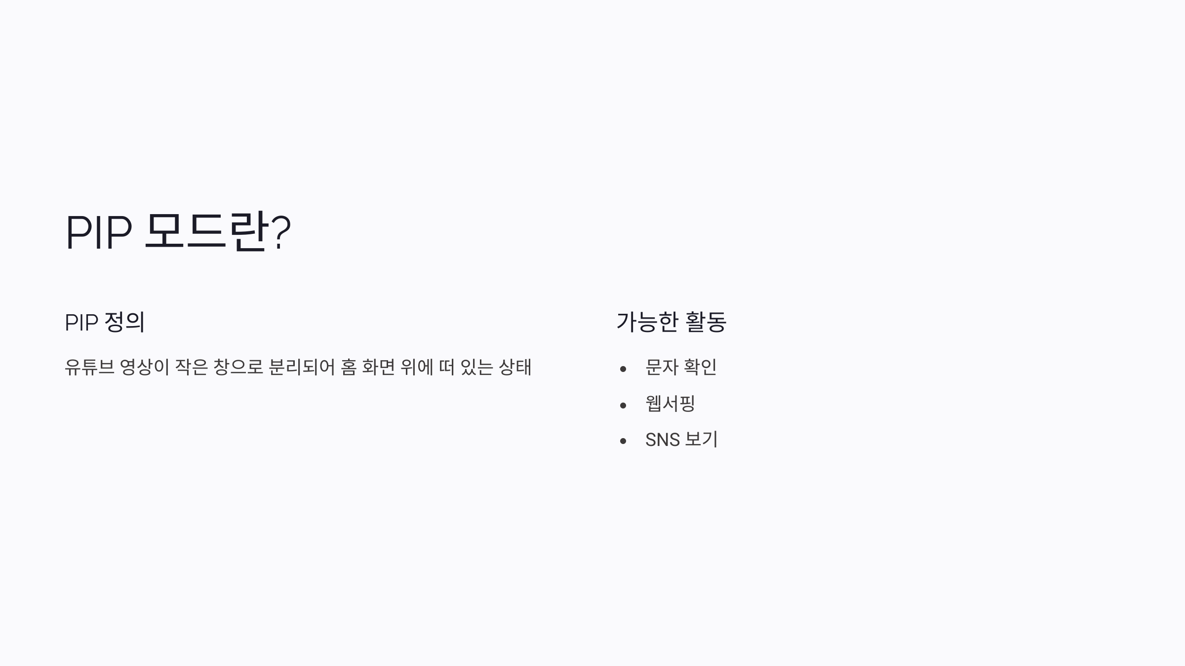 PIP(Picture-in-Picture)는 유튜브 영상이 작은 창으로 분리되어 홈 화면 위에 떠 있는 상태를 말해요.