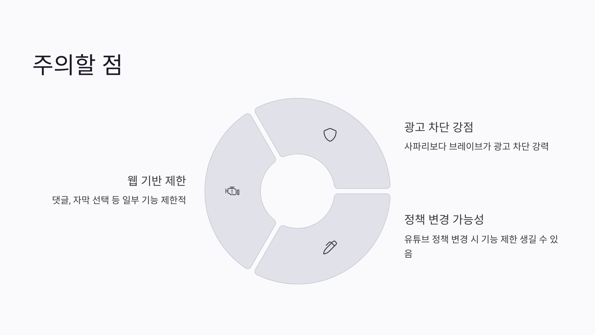 - 브레이브는 유튜브 앱이 아닌 웹 기반 재생이라 일부 기능(댓글, 자막 선택 등)은 제한적일 수 있어요.