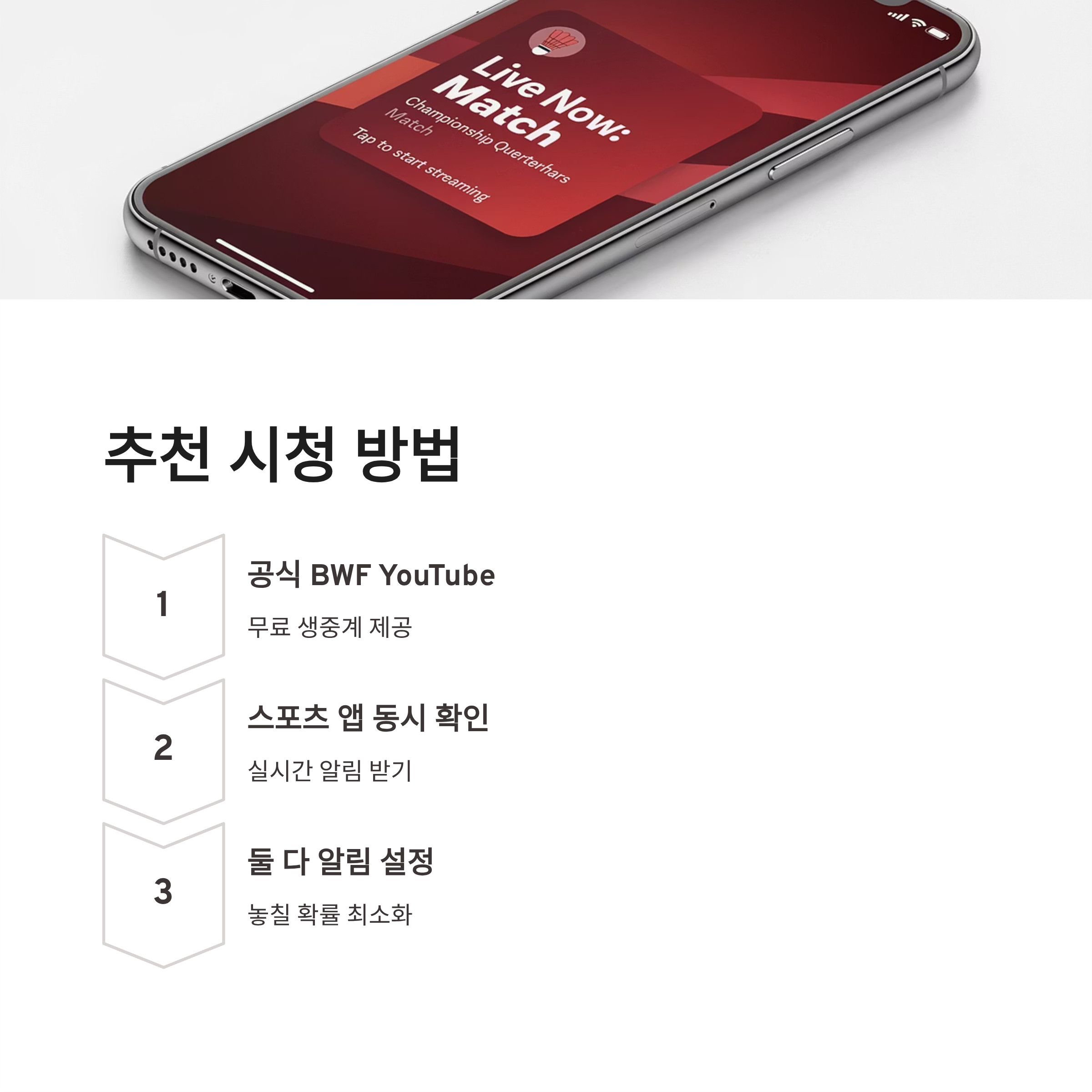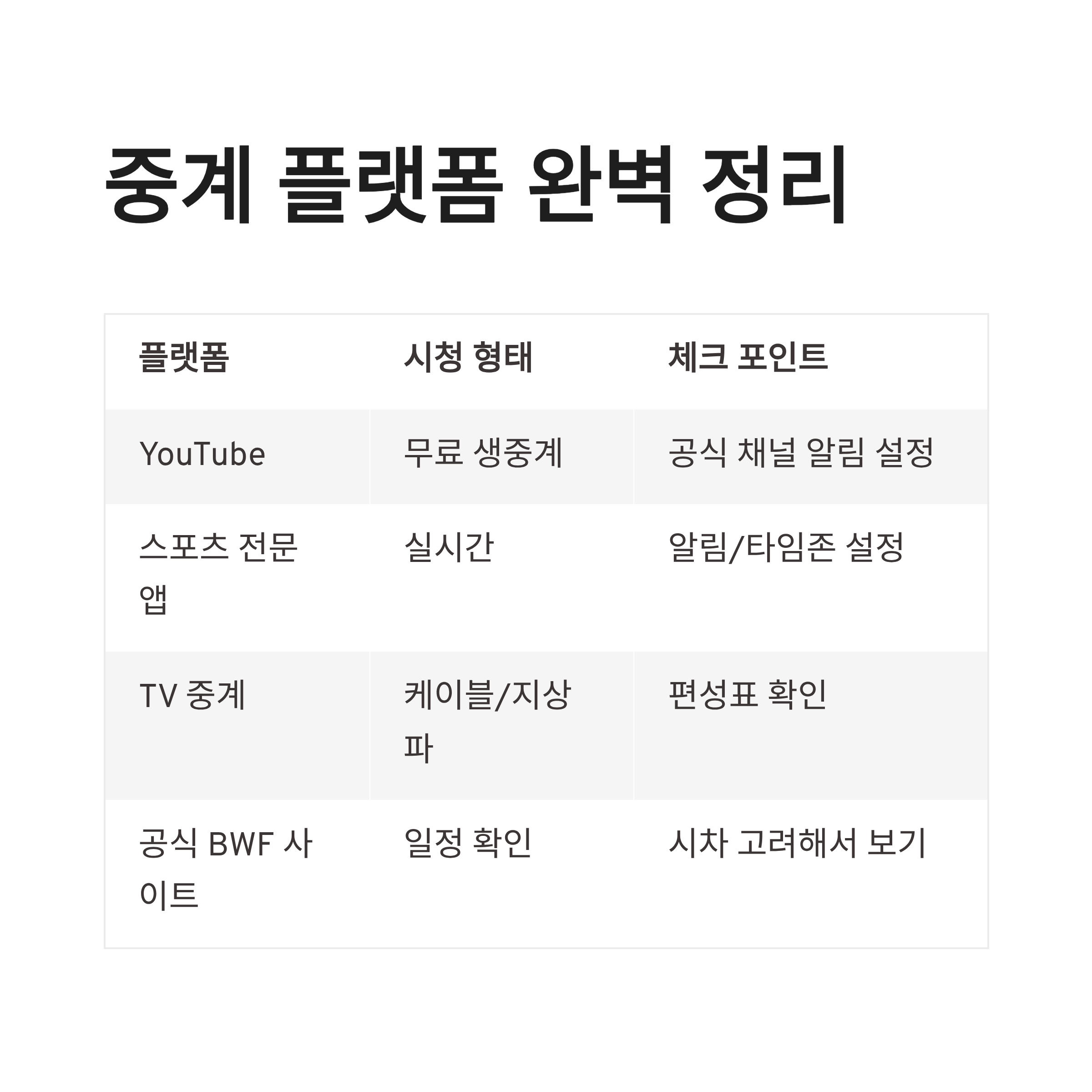 제가 제일 추천하는 건 공식 BWF YouTube + 스포츠 앱 동시 확인이예요. 둘 다 알림 설정해두면 놓칠 확률이 훨씬 줄어요!