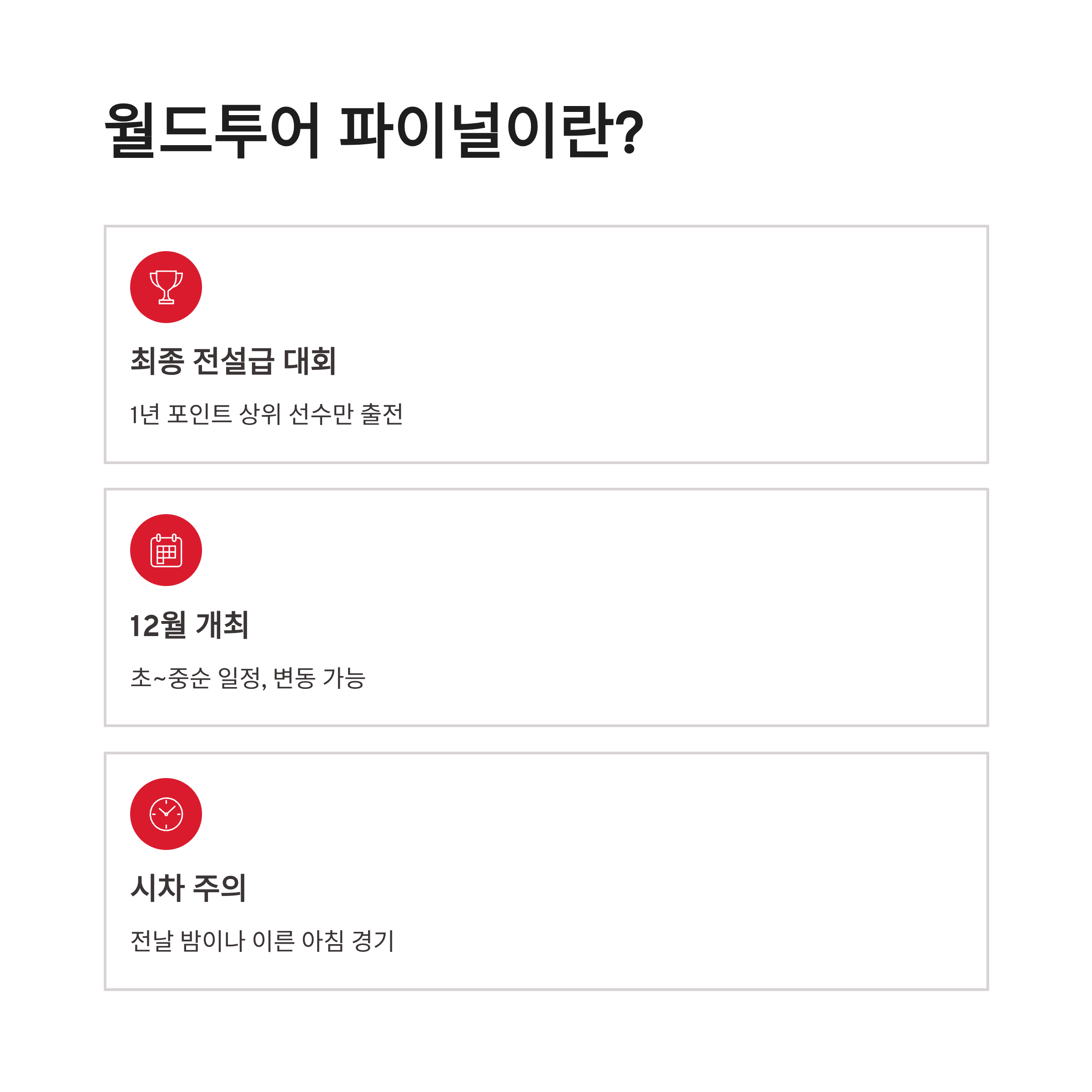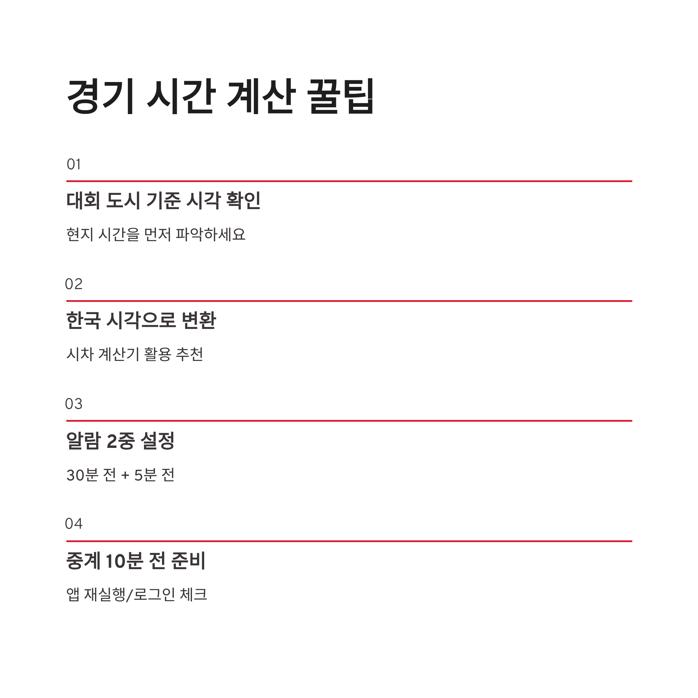 * 대회 도시 기준 시각 → 한국 시각 변환 * 알람 30분 전 / 5분 전 2중 설정 이렇게 해두면 “놓쳤다!!” 하는 일이 훨씬 줄어요. 그리고 꼭 중계 시작 전 10분 전에는 앱 재실행/로그인 체크까지 해요!