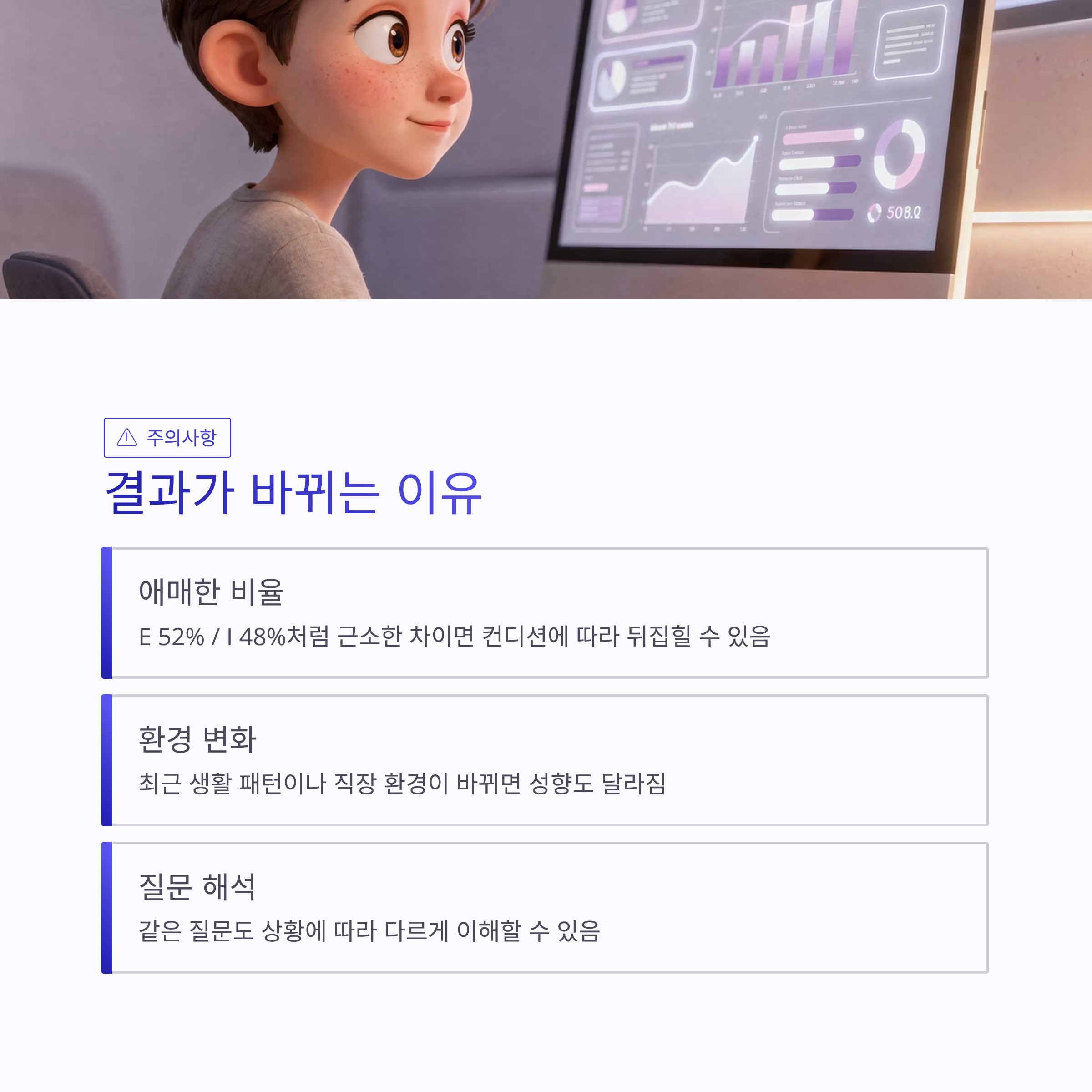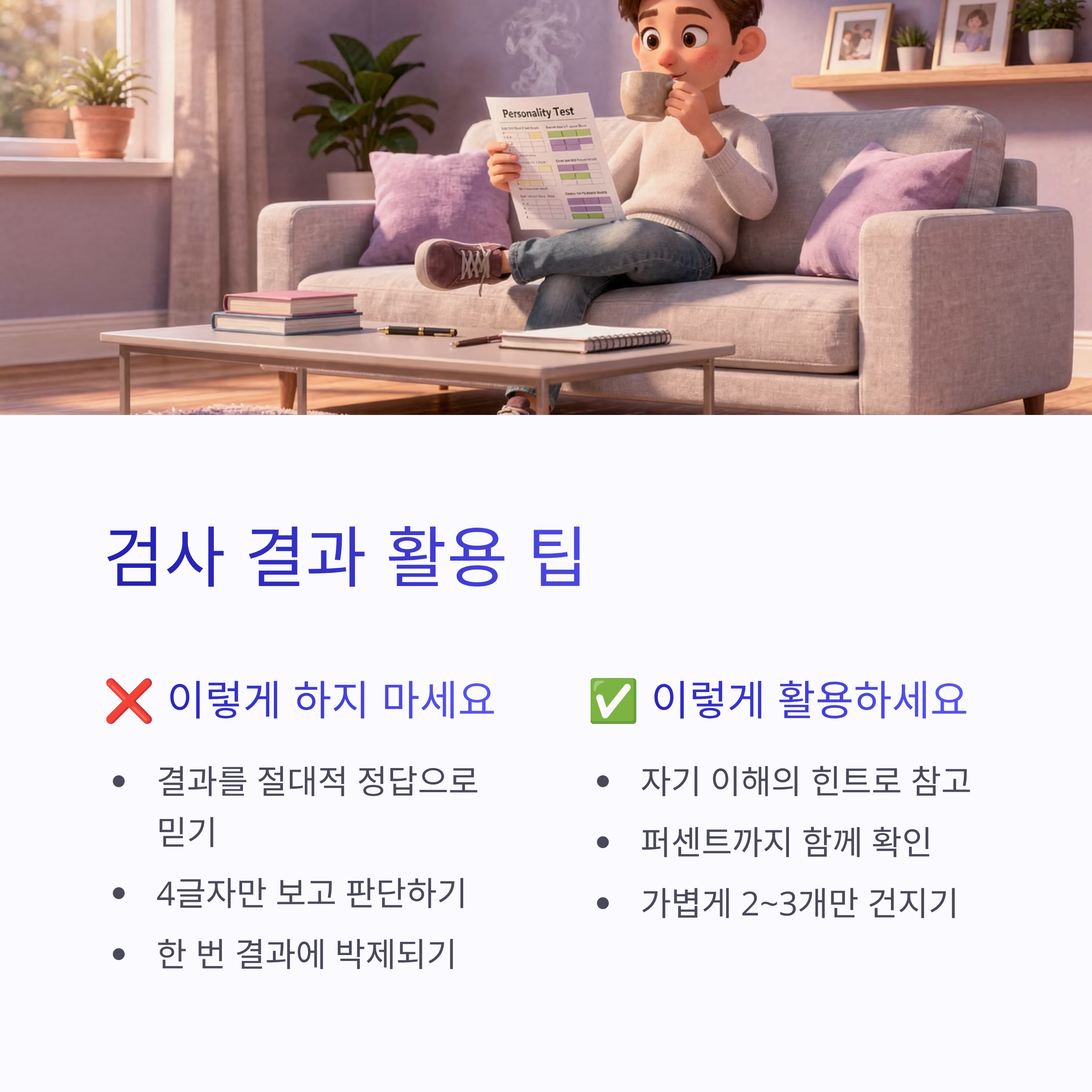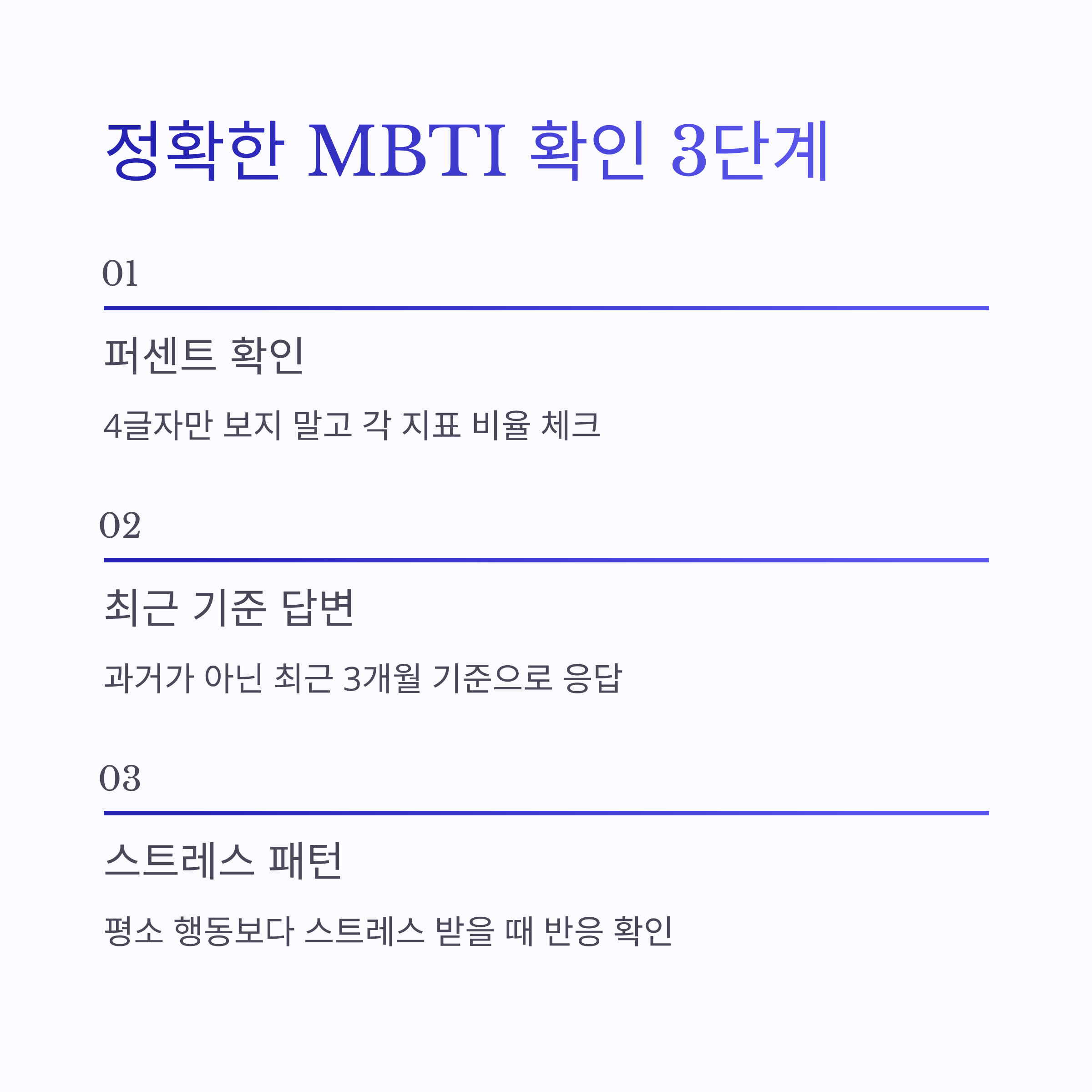 * 1. 4글자만 보지 말고 각 지표 퍼센트 확인 * 2. 애매한 문항(“사람 많은 곳에서 에너지 얻음”)에 과거가 아니라 “최근 3개월” 기준으로 답하기 * 3. 결과 설명 중 ‘자주 하는 행동’이 아니라 ‘스트레스 받을 때 패턴’이 더 잘 맞는지 체크
