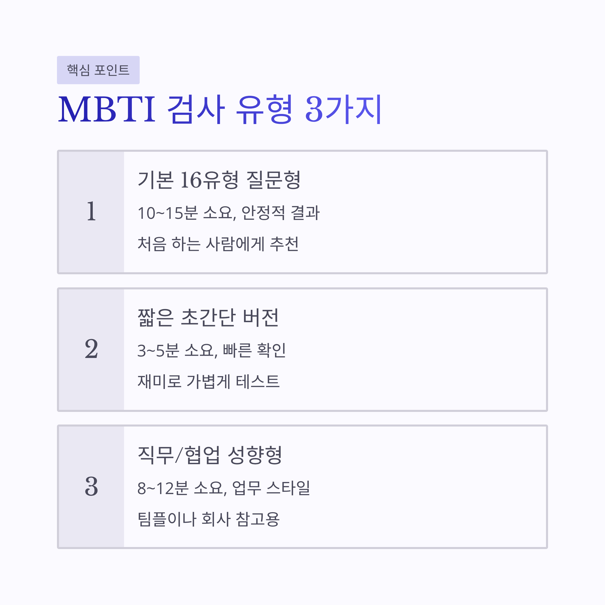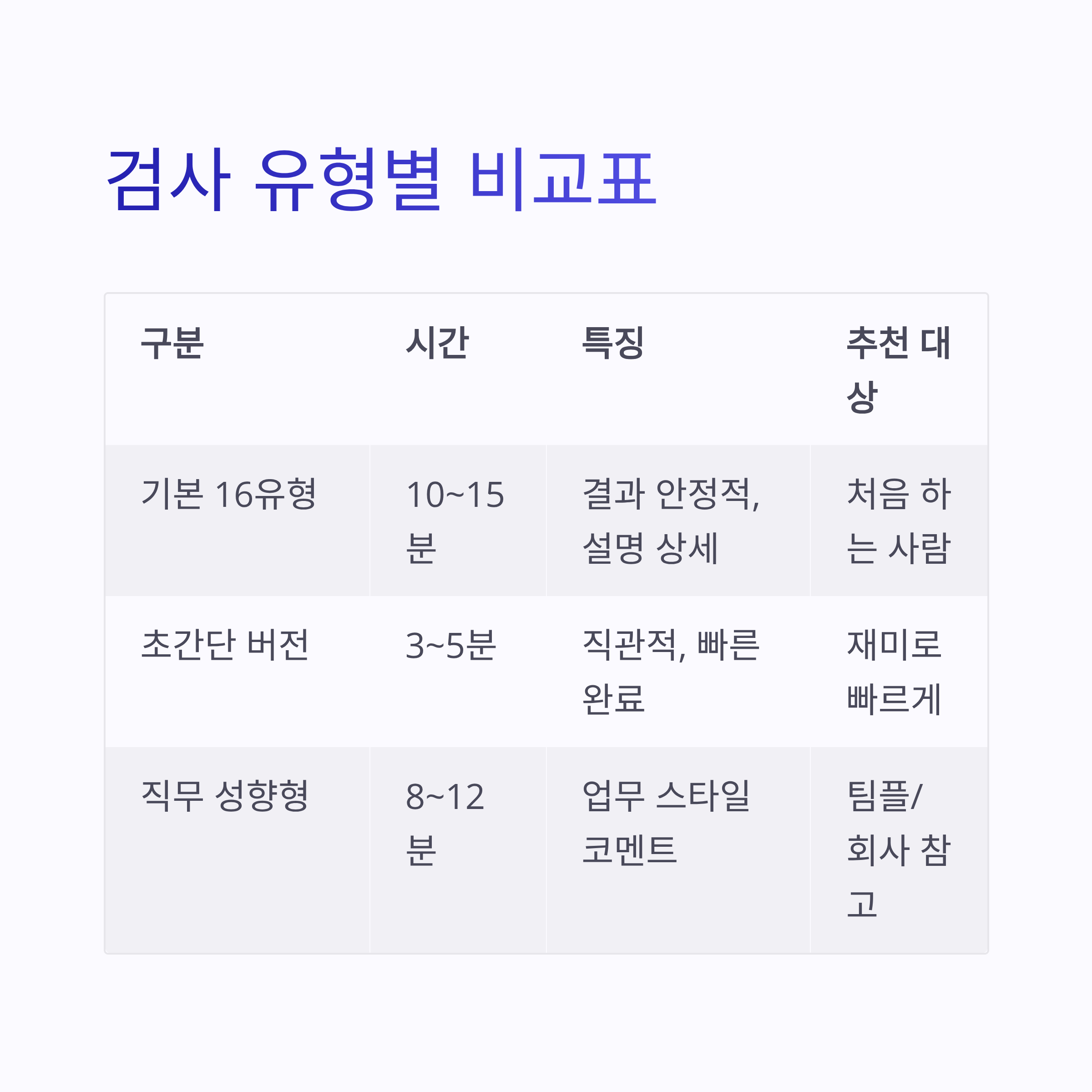 | 기본 16유형 질문형 | 10~15분 | 결과가 비교적 안정적, 설명이 길게 나옴 | 처음 하는 사람 |