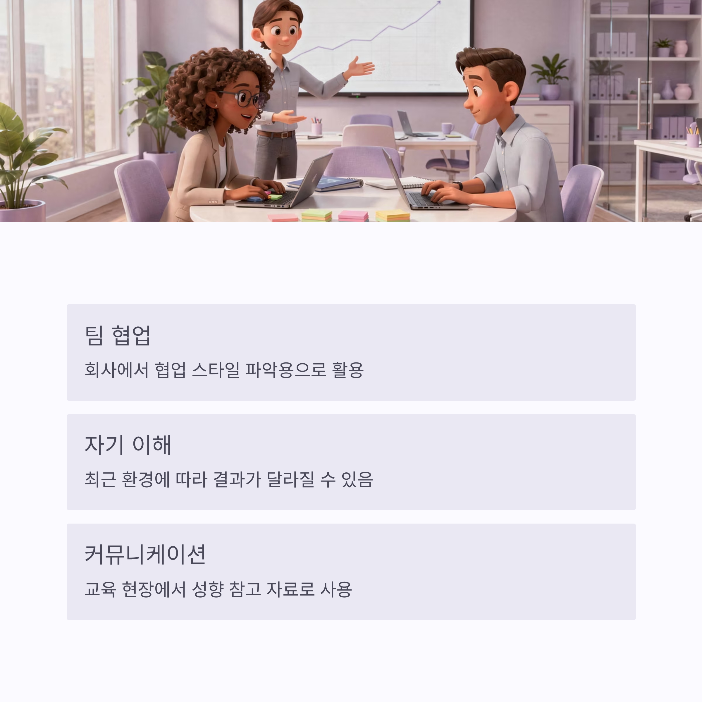 | 직무/협업 성향형 | 8~12분 | 업무스타일 코멘트가 많음 | 팀플/회사에서 참고용 |