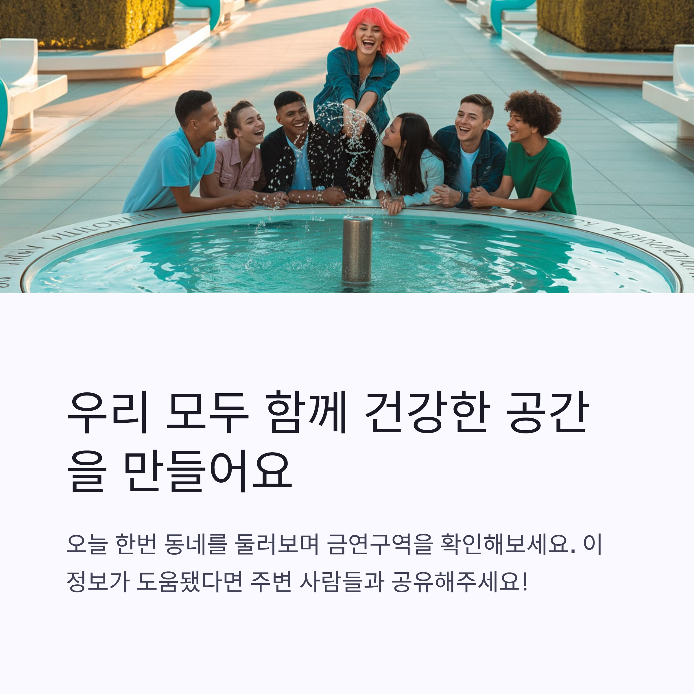 지하철 출입구, 학교 앞, 공원, 병원 주변… 그냥 스쳐 지나던 공간이 금연구역일 수 있어요. 오늘 한 번쯤 주변을 둘러보며, 함께 건강한 공공문화를 만들어가 보아요💚