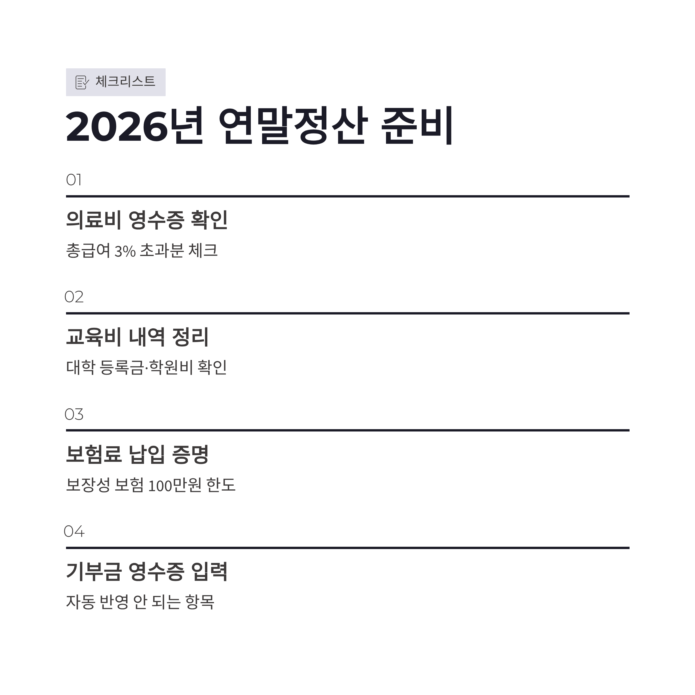 2026년 연말정산 앞두고 있다면, 의료비·교육비·보험료부터 다시 점검해보세요. 이미 쓴 돈이 세금으로 조금이라도 돌아온다는 건 생각보다 기분 좋은 일이더라구요 ㅎㅎ
