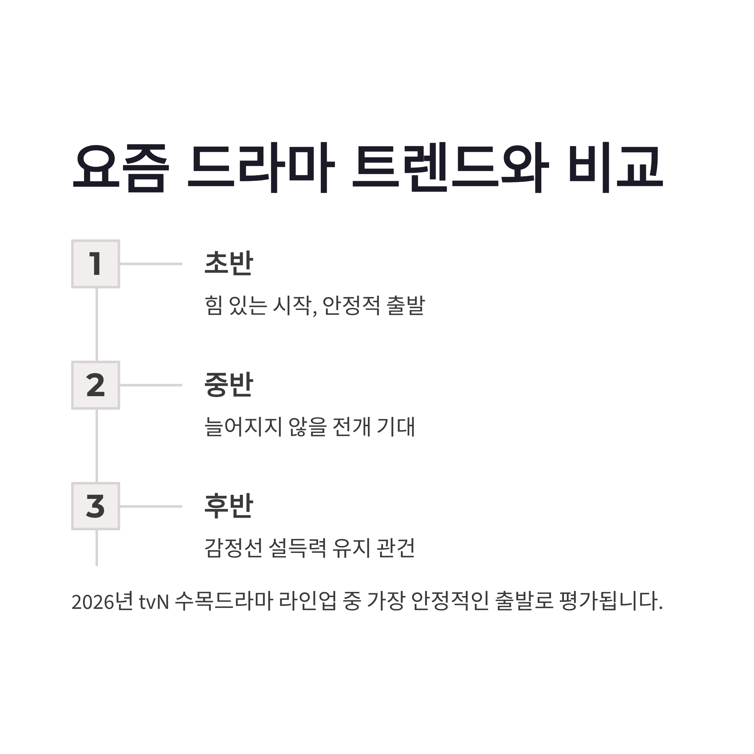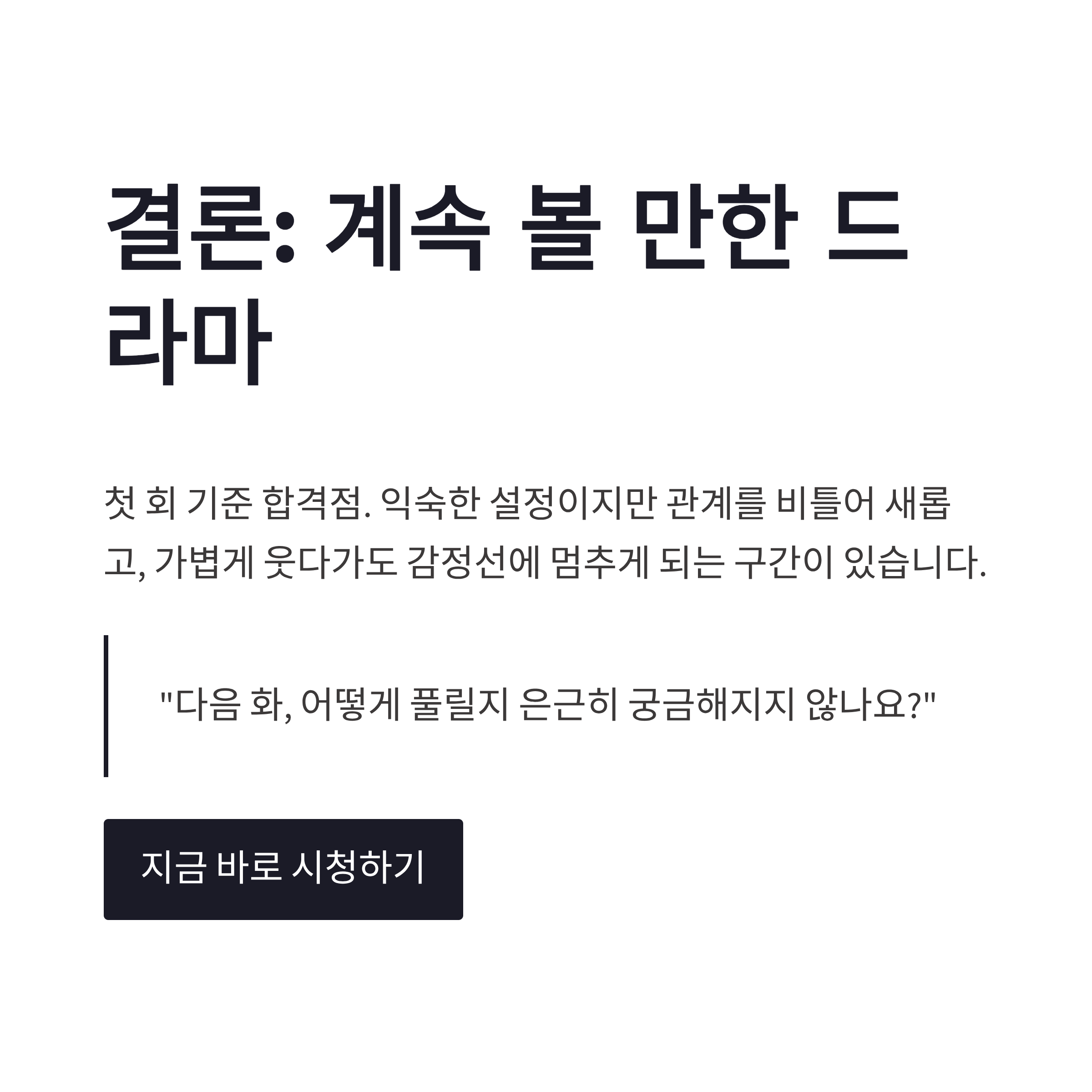 요즘 드라마들 보면 초반에 힘 빡 주고 중반에 늘어지는 경우 많잖아요. 근데 우주를 줄게는 1회 기준으로는 전개가 꽤 단단합니다. 사건 던지고, 관계 꼬고, 캐릭터 성격 보여주고… 이걸 한 회 안에 다 해내더라구요. 장점은 캐릭터 케미와 대사 리듬, 단점이라면 설정이 빠르게 몰려와서 호불호는 갈릴 수 있겠다는 정도? 그래도 2026년 기준 tvN 수목드라마 라인업 중에서는 꽤 안정적인 출발로 보였슴다. 개인적으로는 동거 로맨스 좋아하는 분들이라면 충분히 붙잡힐 작품 같았어요.