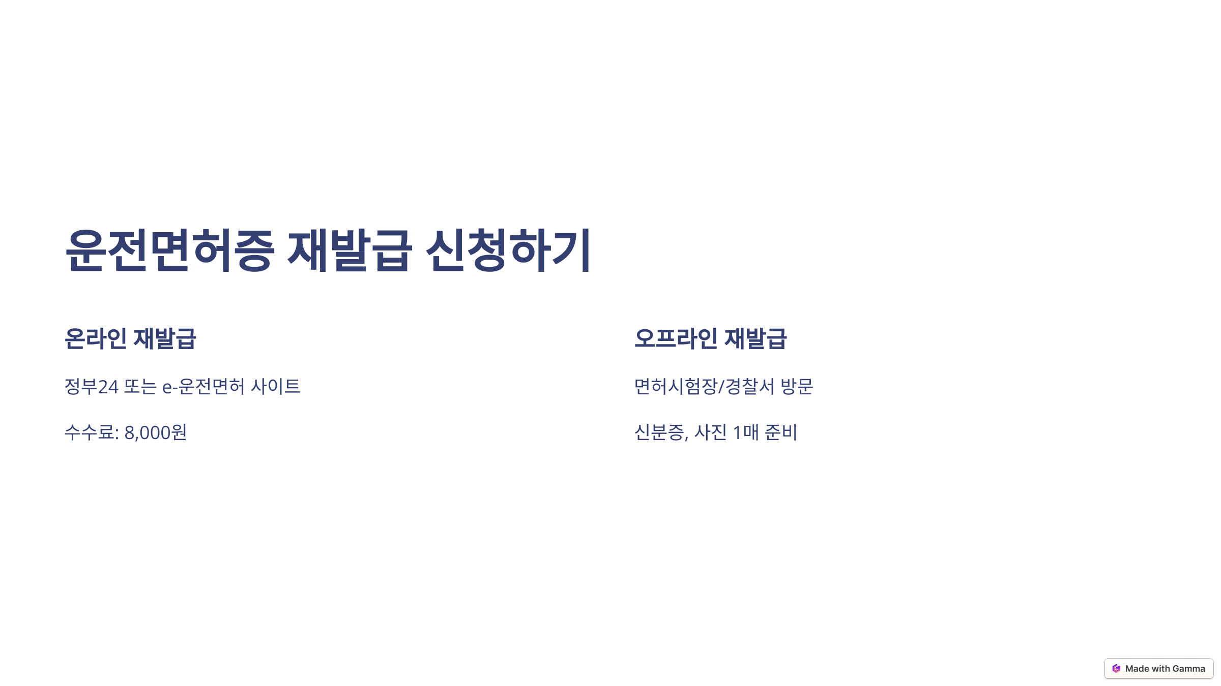 ✔ 정부24 홈페이지 또는 도로교통공단 e-운전면허 사이트에서 신청 ✔ 본인 인증 후 재발급 신청 ✔ 수령 방법 선택 (면허시험장 방문 또는 우편 수령 가능) ✔ 수수료: 8,000원 (카드 결제 가능)