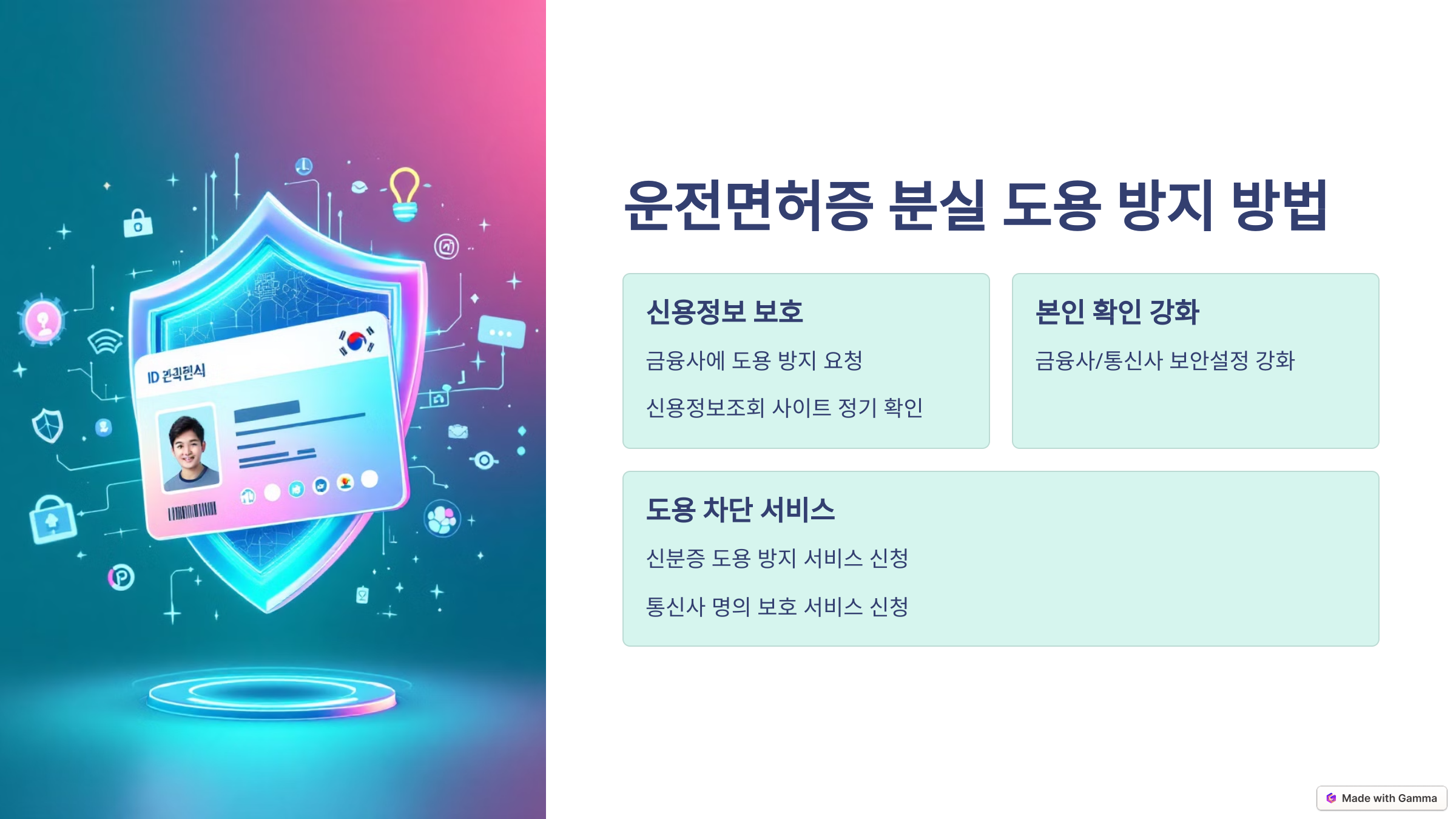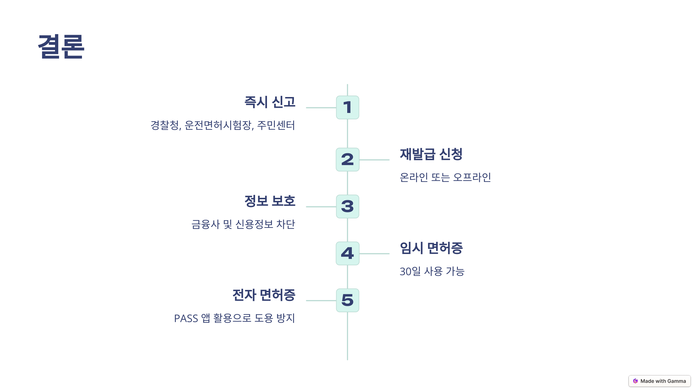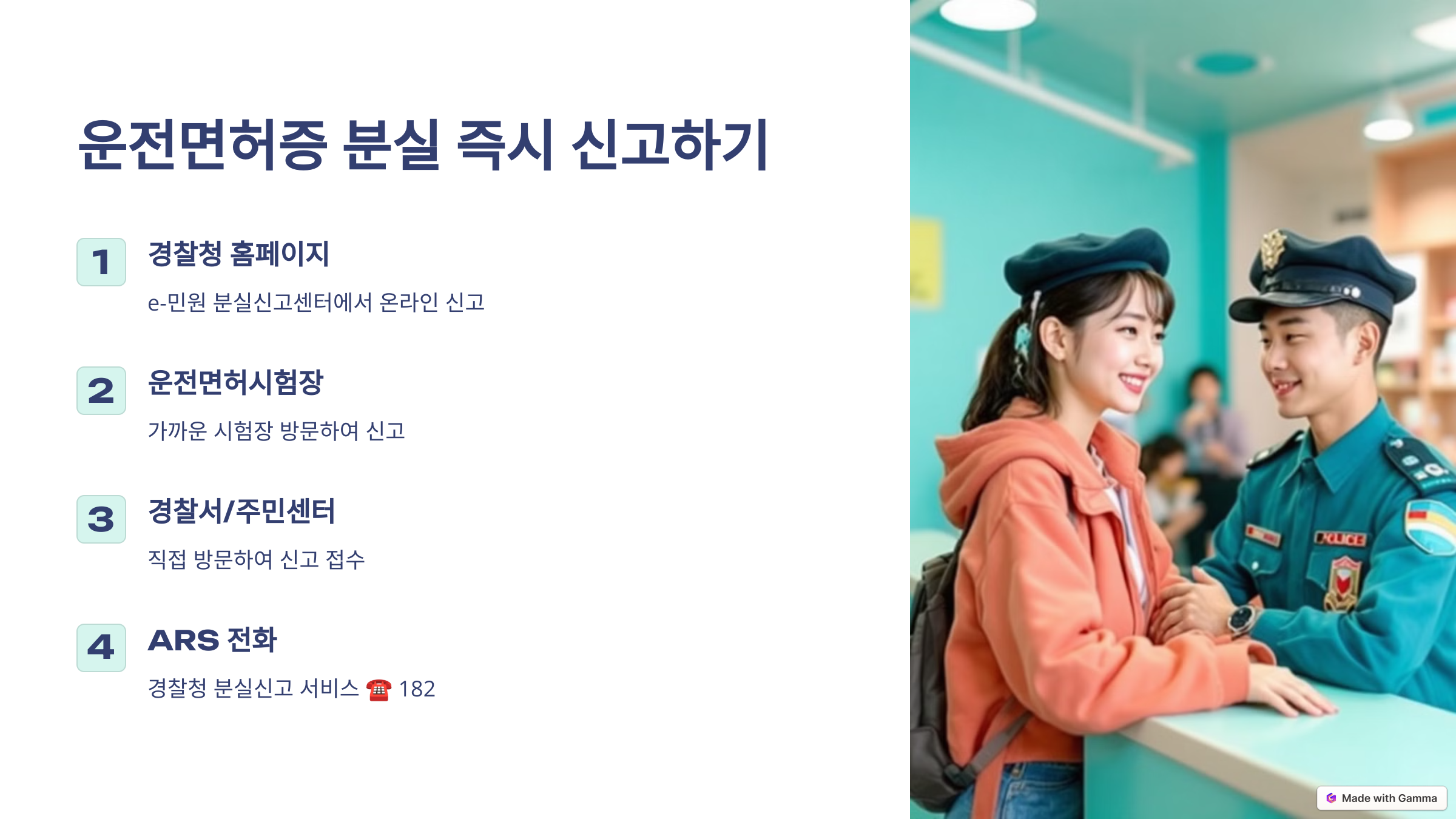 - 즉시 분실 신고 (경찰청, 운전면허시험장, 주민센터)