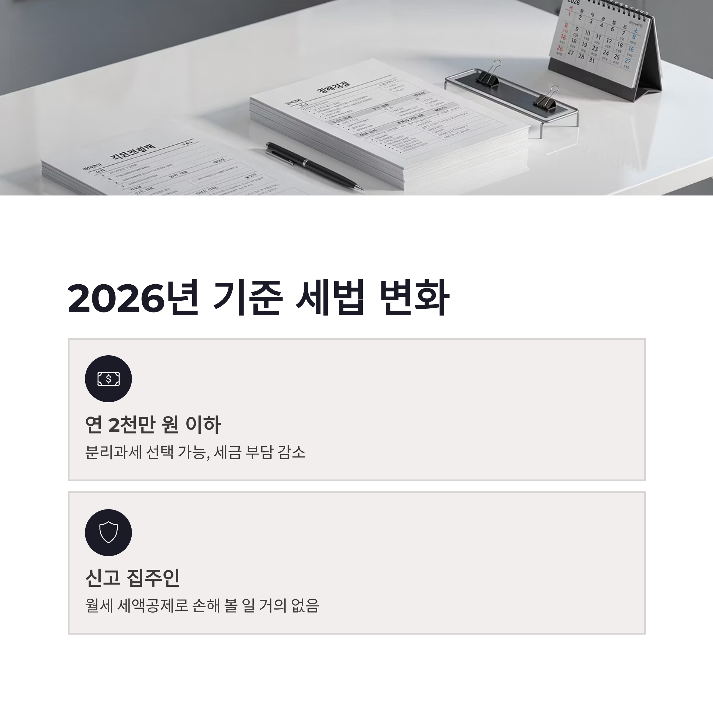 2026년 기준으로 연 2천만 원 이하 임대소득은 분리과세 선택이 가능해서, 예전보다 세금 부담이 꽤 줄었습니다. 이미 신고하고 있는 집주인이라면 월세 세액공제 때문에 손해 볼 일은 거의 없더라구요.