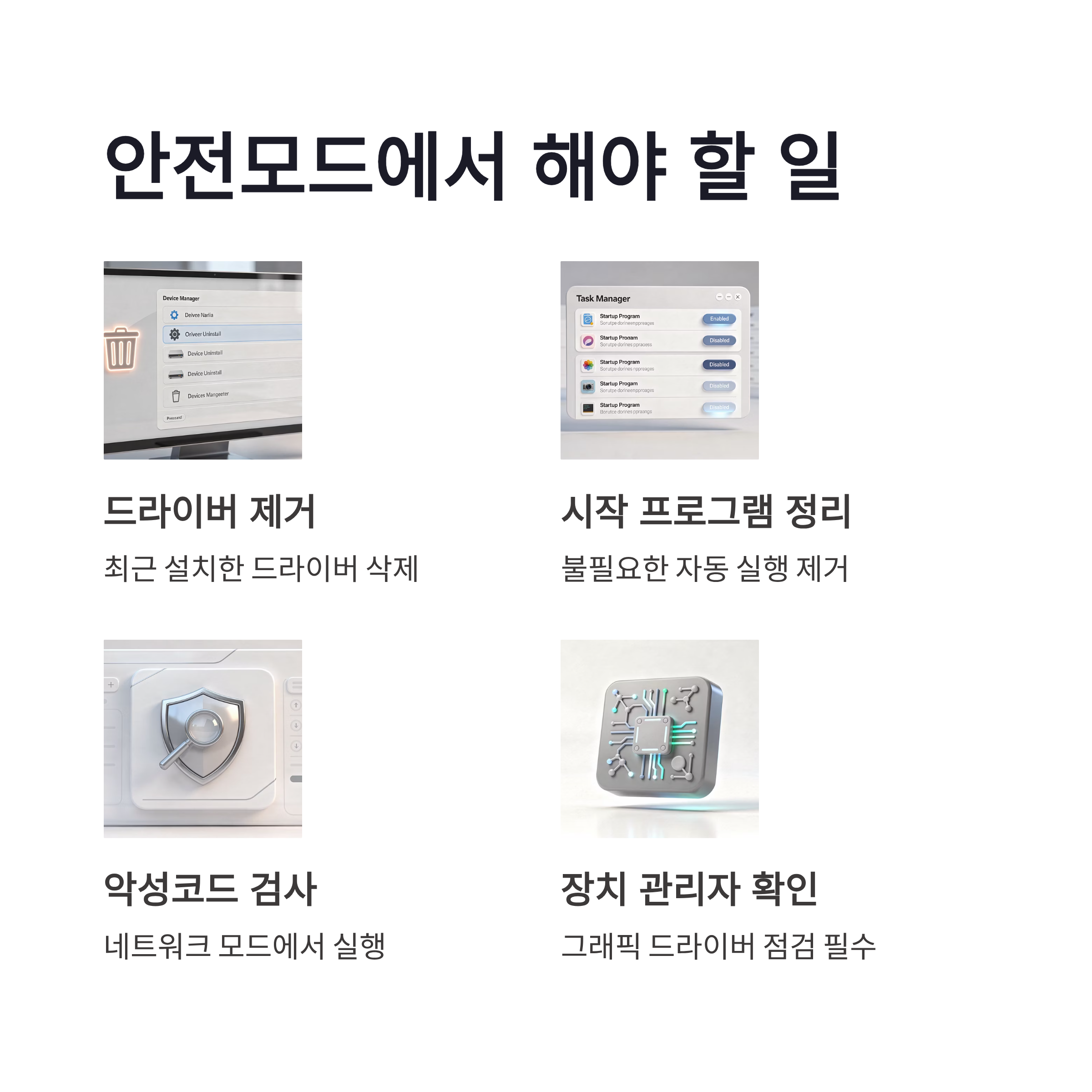 안전모드에 들어왔다고 끝이 아니더라구요. 여기서 뭘 하느냐가 진짜 중요합니다. 저는 보통 최근 설치한 드라이버 제거, 시작 프로그램 정리부터 했구요. 특히 그래픽 드라이버 문제로 블루스크린 나는 경우가 많아서, 장치 관리자 한 번 꼭 확인했어요. 그 다음엔 악성코드 검사. 네트워크 포함 안전모드에서만 가능하니까 상황 보고 선택하면 됩니다. 2026년 기준으로도 마이크로소프트 공식 안내는 복구 환경 기반 안전모드 진입을 가장 안정적인 방법으로 권장하고 있더라구요. 장점은 확실한데, 단점이라면 단계가 살짝 많다는 점? 그래도 윈도우11 안전모드 켜는법은 이 정도만 익혀두면 웬만한 오류는 혼자서도 정리 가능했어요.