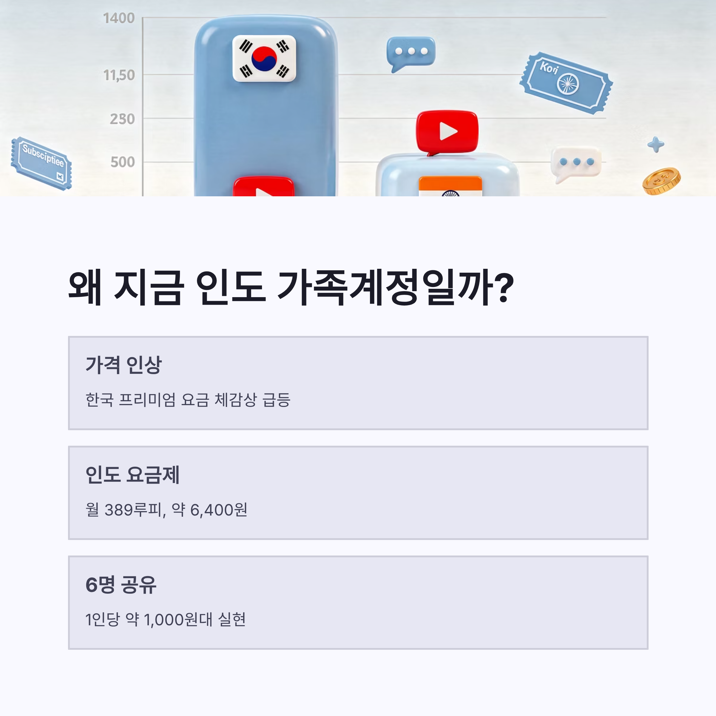 요즘 유튜브 인도 가족계정 추가 검색량이 진짜 확 늘었어요. 이유는 단순합니다. 한국 유튜브 프리미엄 가격이 체감상 너무 올라갔거든요 ㅠㅠ 저도 결제 알림 보고 잠깐 멍… 그래서 이것저것 비교하다가 결국 유튜브 인도 가족계정 추가 쪽으로 정착했구요. 인도 가족 요금제는 월 약 389루피(한화 약 6,400원) 수준인데, 최대 6명까지 사용 가능하다는 게 핵심이에요. 계산해보면 1인당 약 1,000원대라서 솔직히 체감이 다르더라구요. 게다가 각자 구글 계정으로 쓰는 구조라 시청 기록도 완전 분리! 이게 은근 마음 편해요. 이 구조가 진짜 신의 한 수 같더라구요.