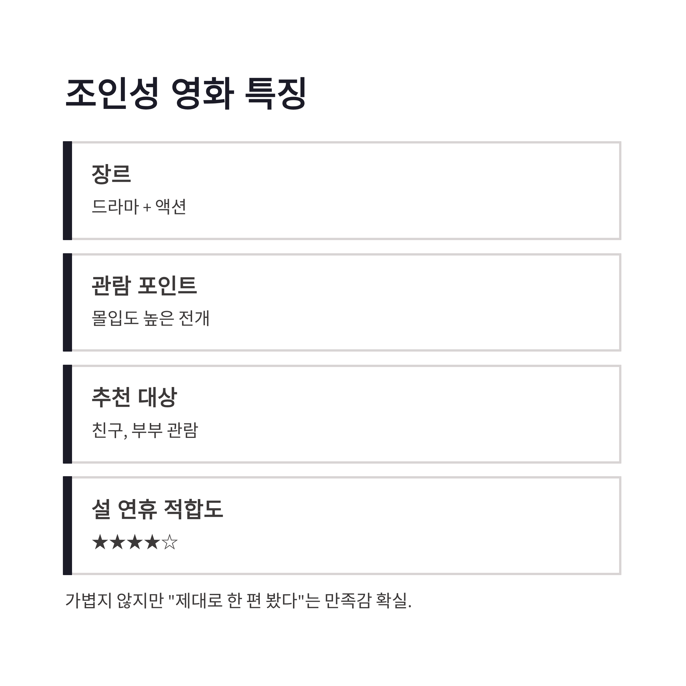 반면에 조인성 설 연휴 영화는 분위기가 확 다릅니다. 이번 설 극장가에서 가장 ‘극장용’ 느낌이 강한 작품이랄까. 화면 꽉 차는 연출, 묵직한 서사, 그리고 조인성 특유의 카리스마가 전면에 나오는 구조였어요. 아래처럼 정리해보면 느낌이 좀 오실 듯요.