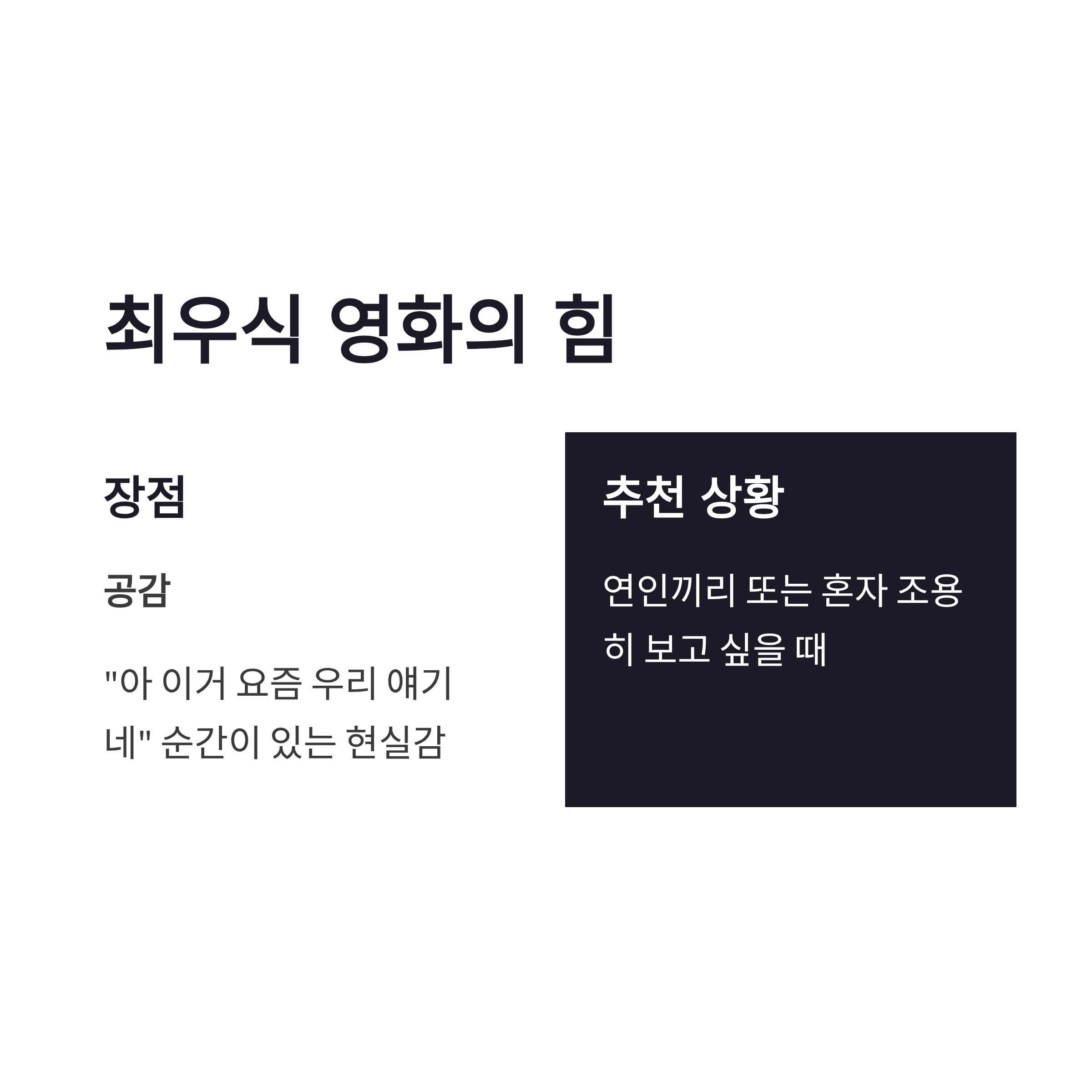 요즘 극장가에서 최우식 설 연휴 영화 빠지면 섭섭하죠. 이번 작품은 잔잔한데 묘하게 현실적이고, 보고 나면 혼자 생각 많아지는 스타일이었어요. 설날에 이런 영화 좀 애매한 거 아니야? 싶었는데, 의외로 반응 좋을 타입이더라구요. 장점은 공감, 단점은 호불호. 전 개인적으로 “아 이거 요즘 우리 얘기네…” 이런 순간이 있어서 더 기억에 남았슴다. 연인끼리 보거나 혼자 조용히 보고 싶을 때 잘 맞는 영화였어요.