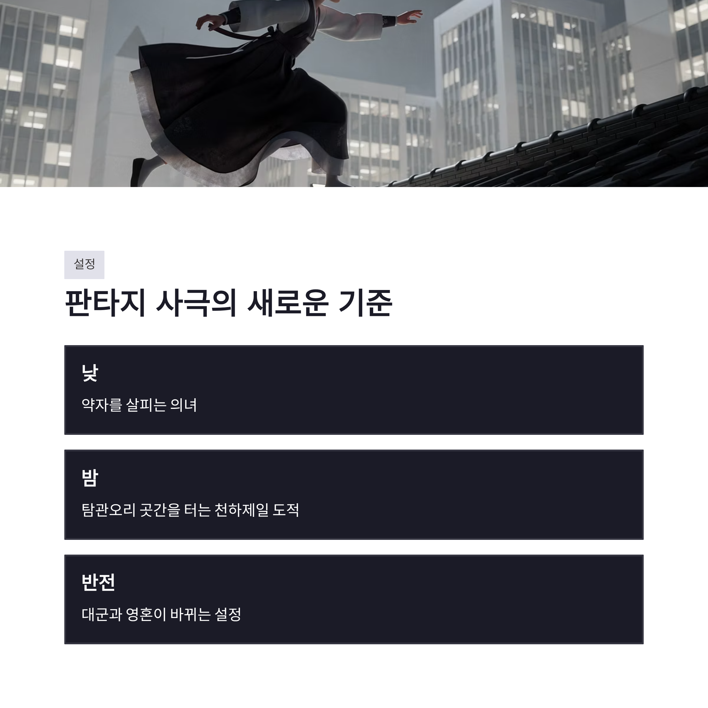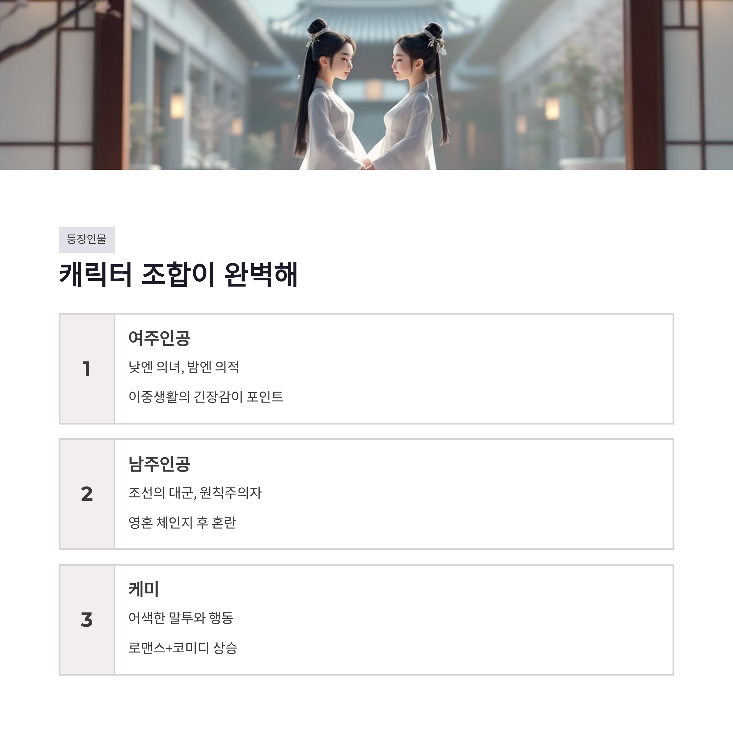 | 여주 | 낮엔 의녀, 밤엔 의적 | 이중생활 긴장감 큼 |