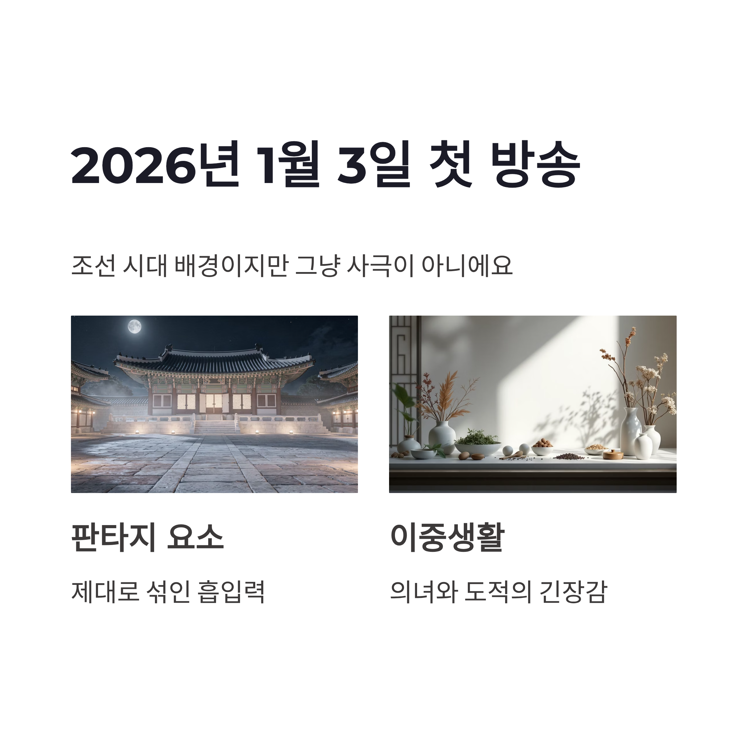 요즘 주말 저녁마다 괜히 TV 앞에 먼저 앉게 되더라구요. 바로 은애하는 도적님아 드라마 때문인데요. 2026년 1월 3일 첫 방송 이후 반응이 생각보다 훨씬 뜨거워서 놀랐어요. 조선 시대를 배경으로 하지만 그냥 사극이 아니라, 판타지 요소가 제대로 섞여 있어요. 낮에는 약자를 살피는 의녀, 밤에는 탐관오리 곳간을 터는 천하제일 도적. 거기에 그녀를 쫓던 조선의 대군과 영혼이 바뀌는 설정까지… 처음엔 “이거 과한 거 아냐?” 싶었는데, 막상 보니까 흡입력이 장난 아니더라구요. 은애하는 도적님아 드라마는 설정부터 이미 승부 본 느낌이었구요, 첫 회부터 몰입도가 확 올라갔습니다.