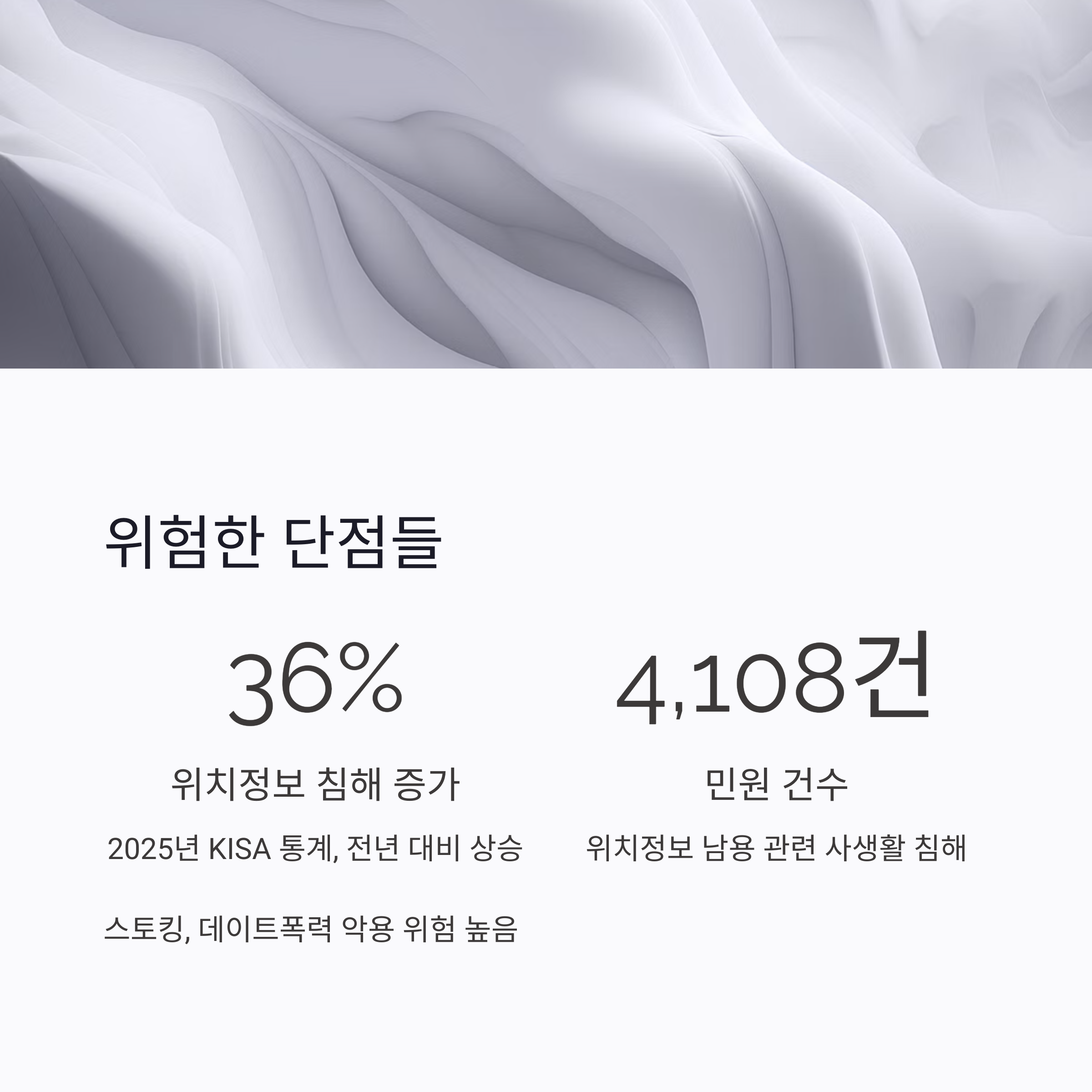 실제 2025년 4월 기준 한국인터넷진흥원(KISA) 통계에 따르면, 위치 정보 남용으로 인한 사생활 침해 민원은 전년 대비 36% 상승했대요(총 4,108건)😨 특히 SNS 연동 GPS 남용이 많았다네요...