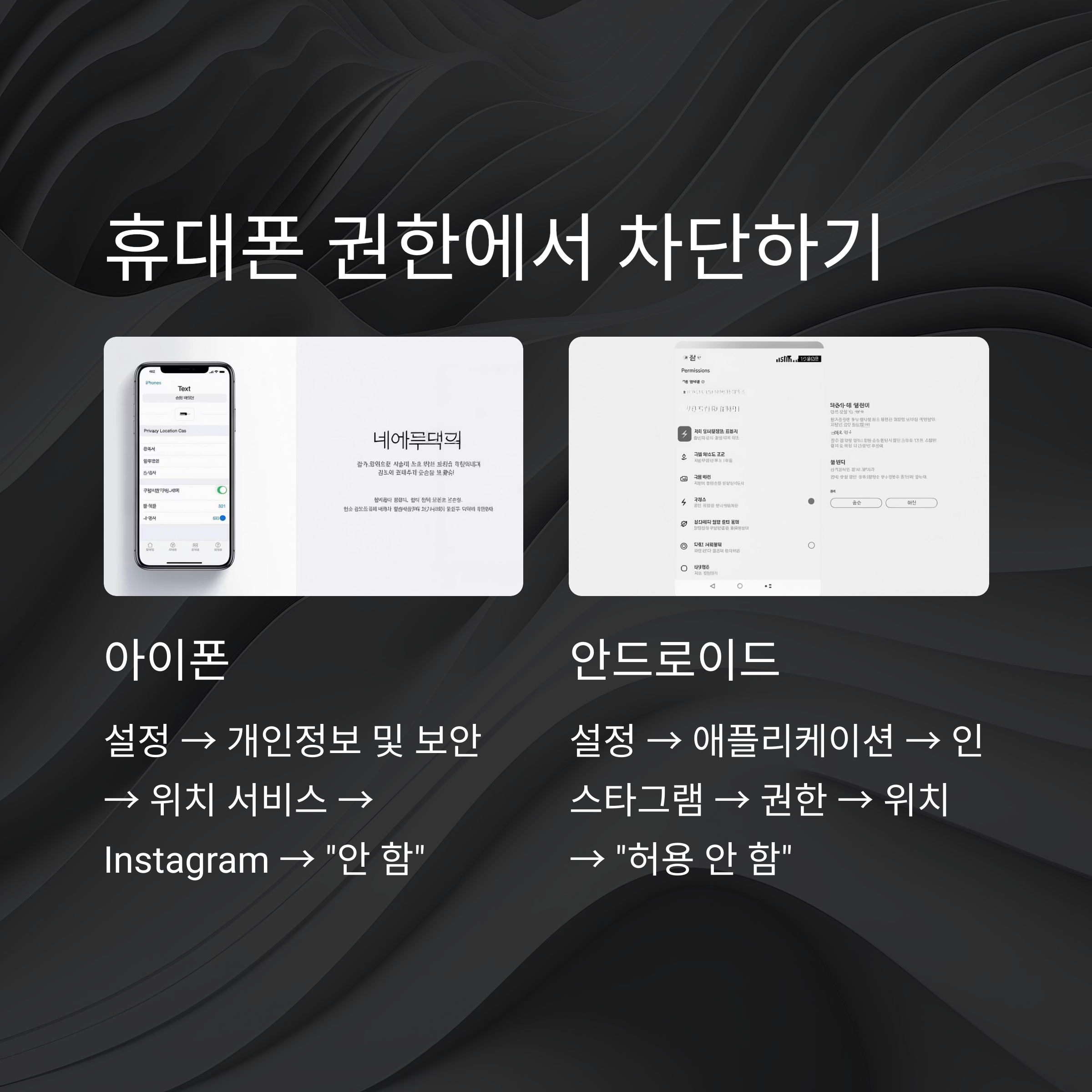 - 아이폰: 설정 → 개인정보 및 보안 → 위치 서비스 → Instagram → “안 함”
