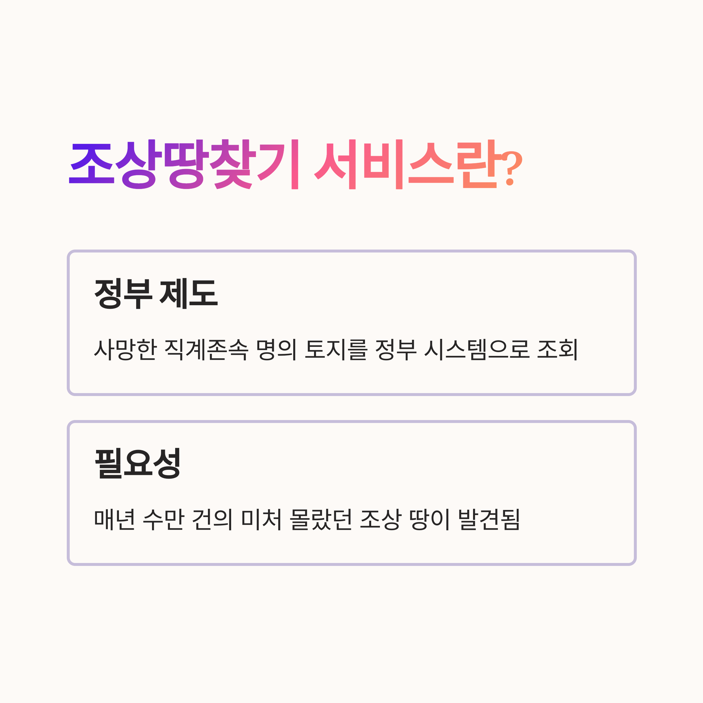 조상땅찾기 서비스는 사망한 가족(직계존속)이 생전에 본인 명의로 보유한 토지가 있는지를 정부 시스템을 통해 조회할 수 있도록 만든 제도입니다.