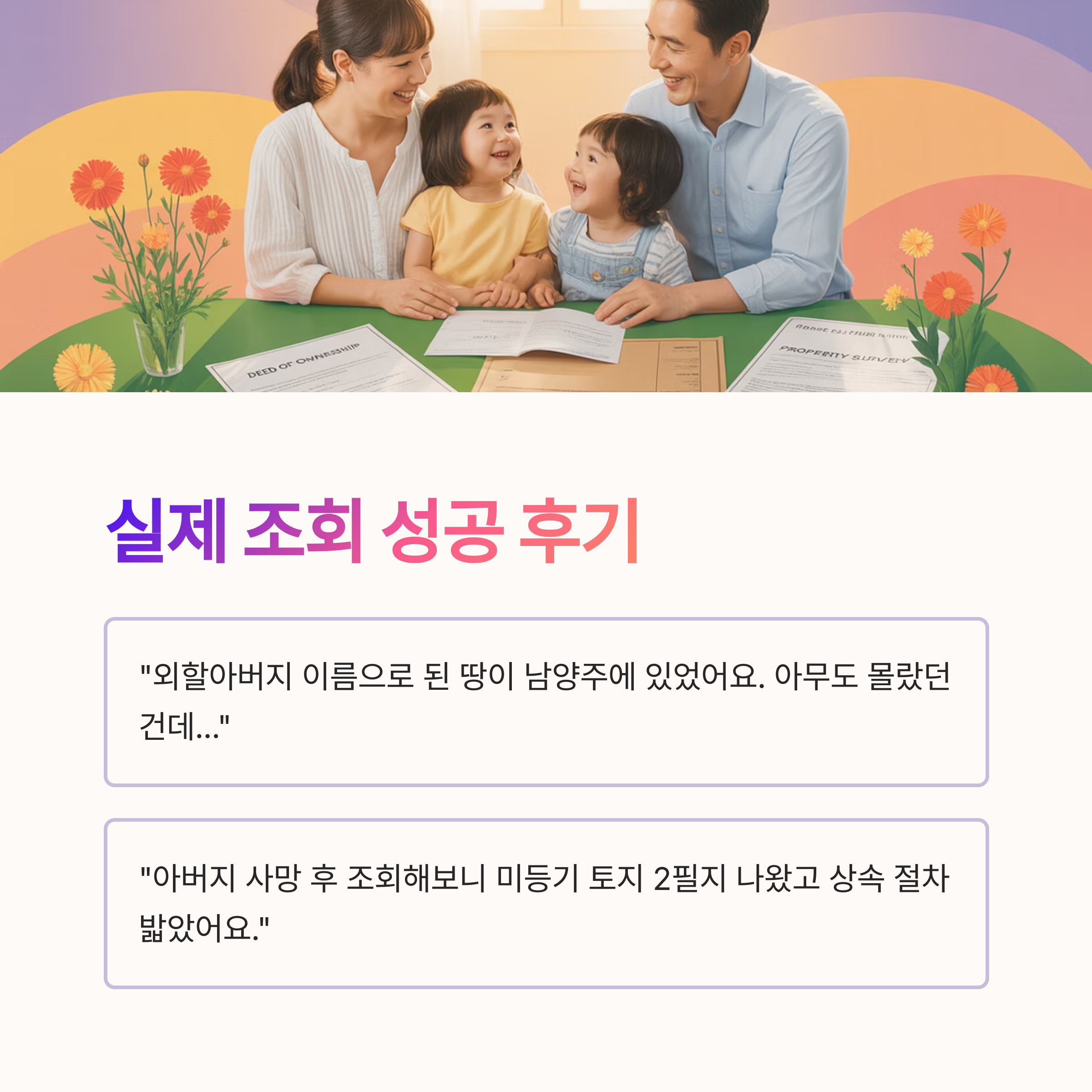 “아버지 사망 이후 상속 진행 안 했었는데, 조회해보니 미등기 토지 2필지 나왔고 상속 절차 바로 밟았어요.” - 📍 대구 / 청년 C씨