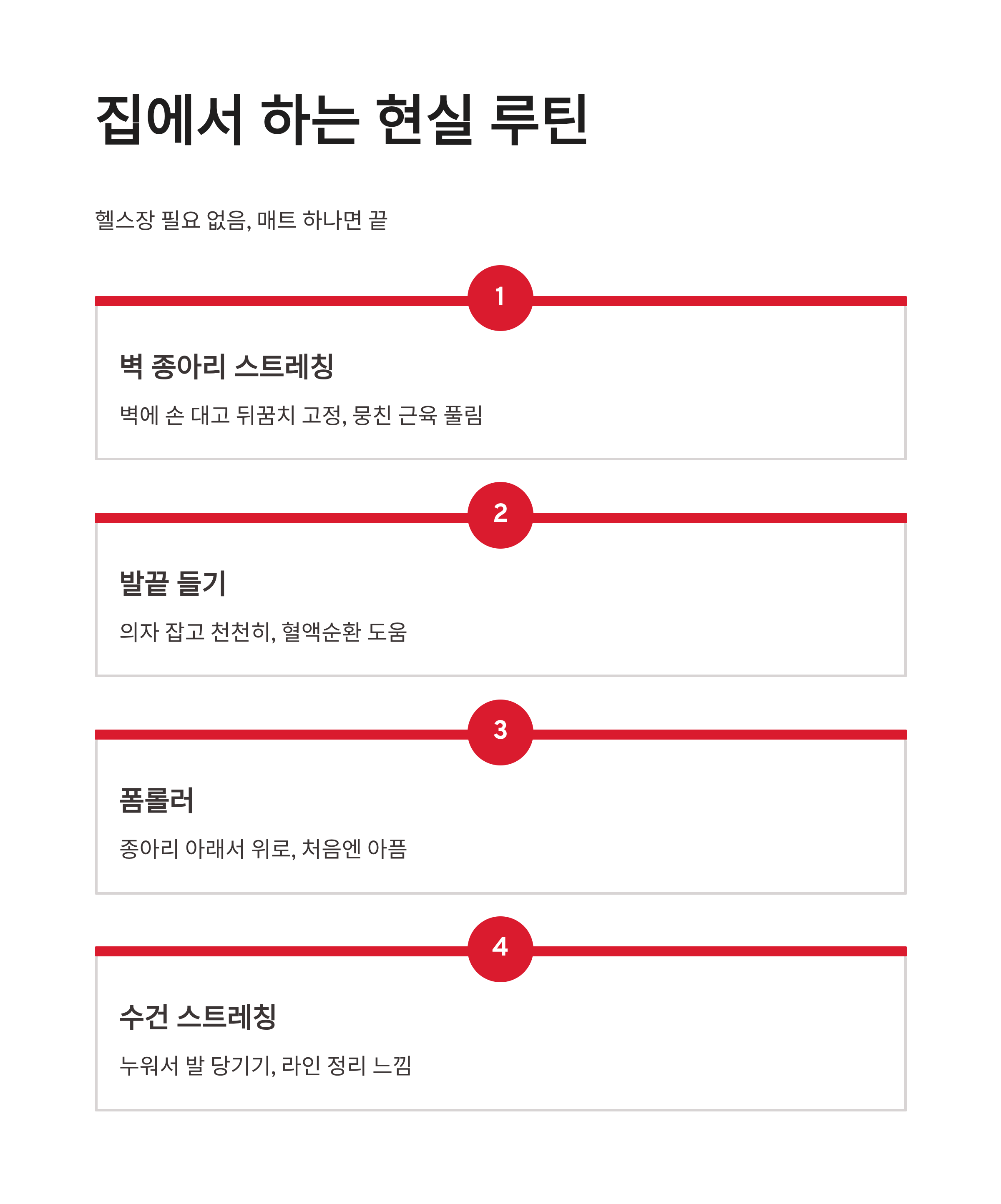 | 벽 종아리 스트레칭 | 벽에 손 대고 뒤꿈치 고정 | 뭉친 근육 풀림 |