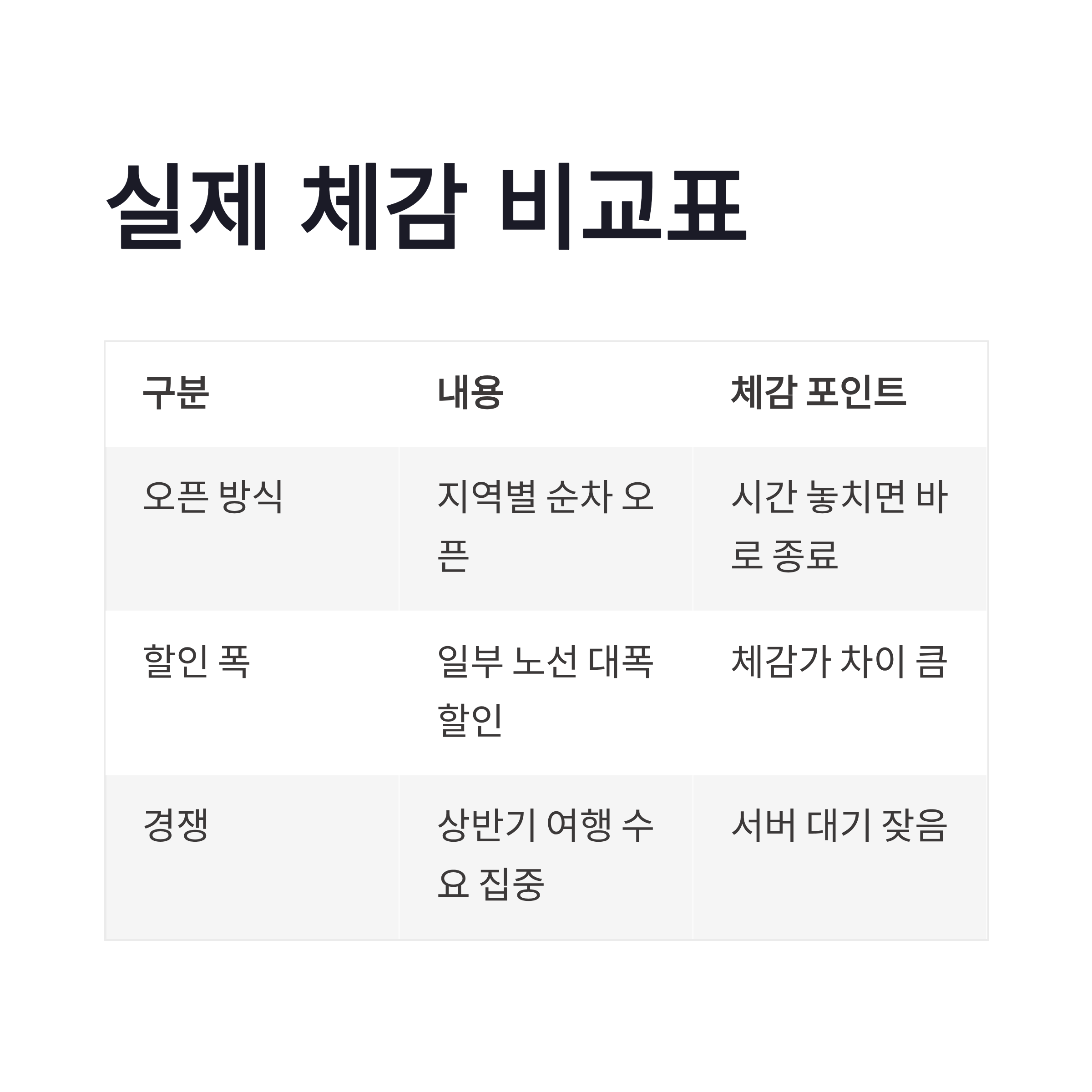 | 할인 폭 | 일부 노선 대폭 할인 | 체감가 차이 큼 |