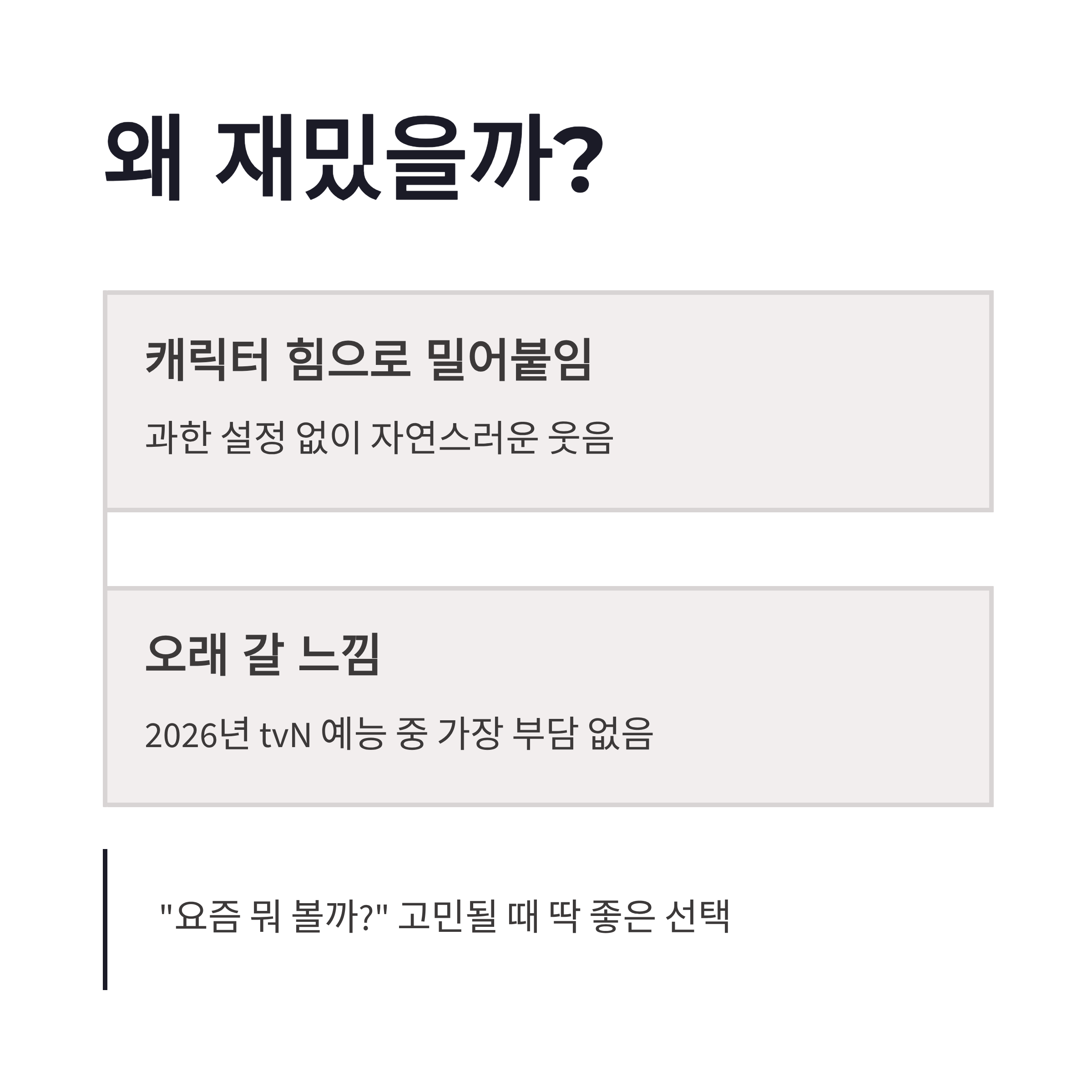 보면서 느낀 건, 누가 튀려고 애쓰는 예능이 아니라서 편하더라구요. 이게 은근 중독됩니다.