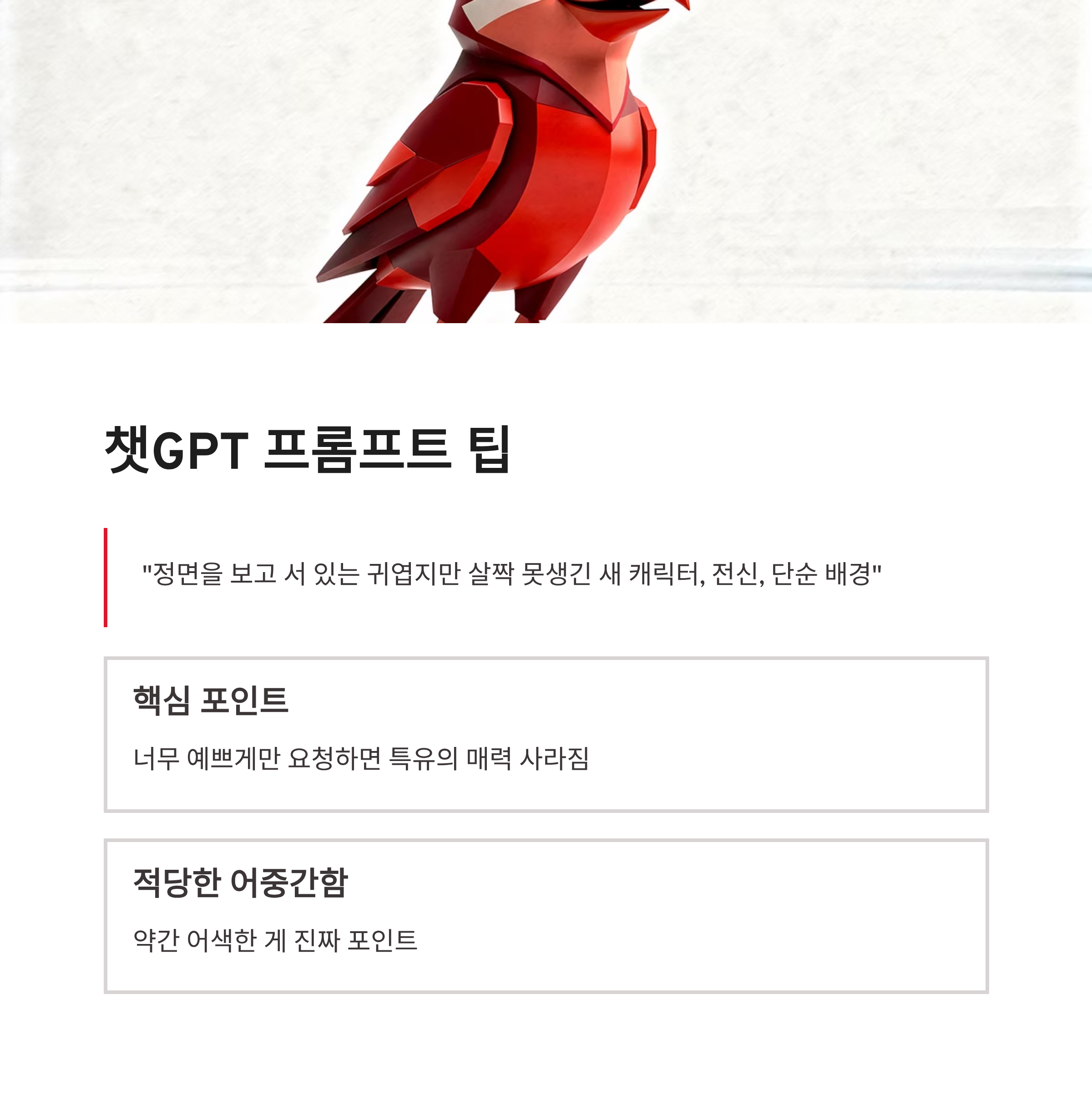 챗GPT에 요청할 때는 “정면을 보고 서 있는 귀엽지만 살짝 못생긴 새 캐릭터, 전신, 단순 배경” 이런 식으로 말해주면 잘 나오더라구요. 너무 예쁘게만 요청하면 아름답고 미운 새 챌린지 특유의 매력이 사라져서 아쉽더라구요. 약간 어중간해야 진짜 포인트임다 ㅋㅋ