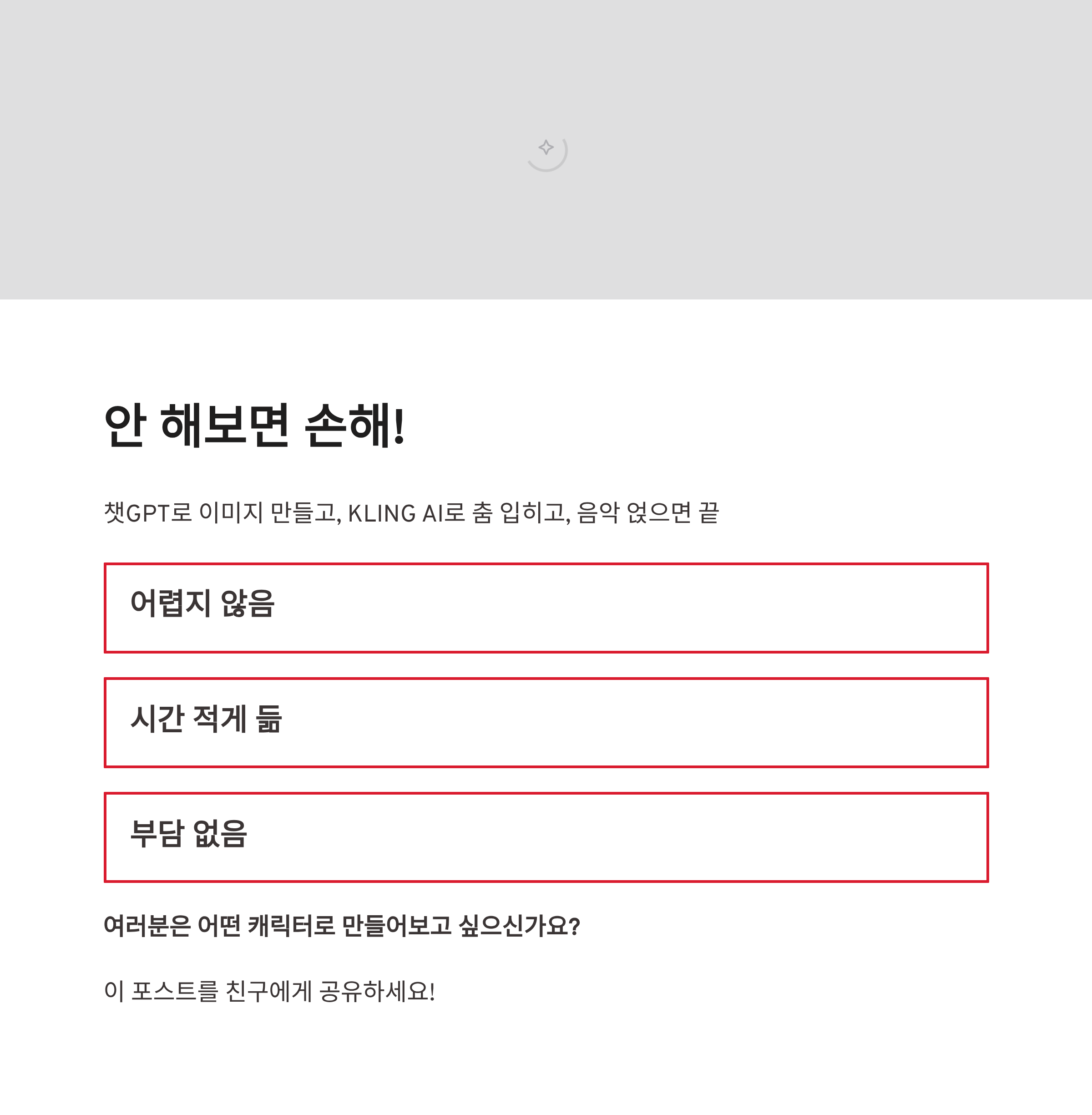 정리해보면 아름답고 미운 새 챌린지는 요즘 릴스 감성에 딱 맞는 콘텐츠 같아요. 챗GPT로 이미지 만들고, KLING AI로 춤 입히고, 음악 얹으면 끝. 어렵지도 않고, 시간도 많이 안 들어서 부담 없이 해볼 수 있더라구요. 저처럼 “릴스 뭐 올리지…” 고민 중이라면 한 번쯤 꼭 해보시길 추천해요. 만들다 보면 은근 중독됨다 ㅎㅎ 여러분은 어떤 캐릭터로 만들어보고 싶으신가요?