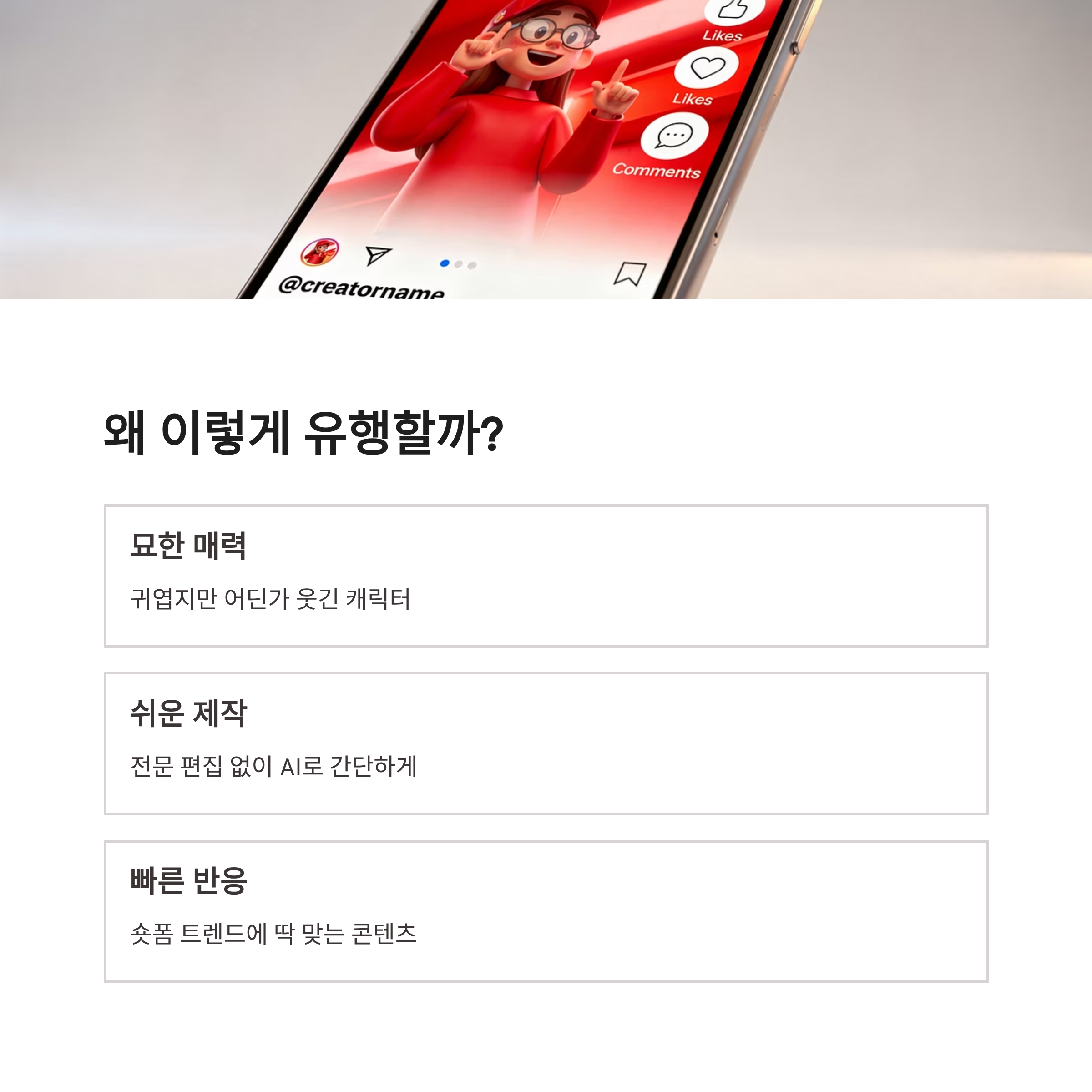 2025년 들어서 이 챌린지가 더 뜨는 이유가 있어요. 숏폼 트렌드가 완성도보다 캐릭터성을 더 보잖아요. 완벽하지 않은 게 오히려 공감되고, 웃기고, 저장하게 만드는 느낌? 장점은 확실해요. 제작 시간 짧고, 얼굴 공개 부담 없고, 반응도 빨라요. 단점이라면… 한 번 빠지면 계속 만들게 된다는 점 ㅠㅠ 그리고 캐릭터 프롬프트 살짝만 잘못 쓰면 무섭게 나올 수도 있음… 이건 진짜 주의요 ㅋㅋ