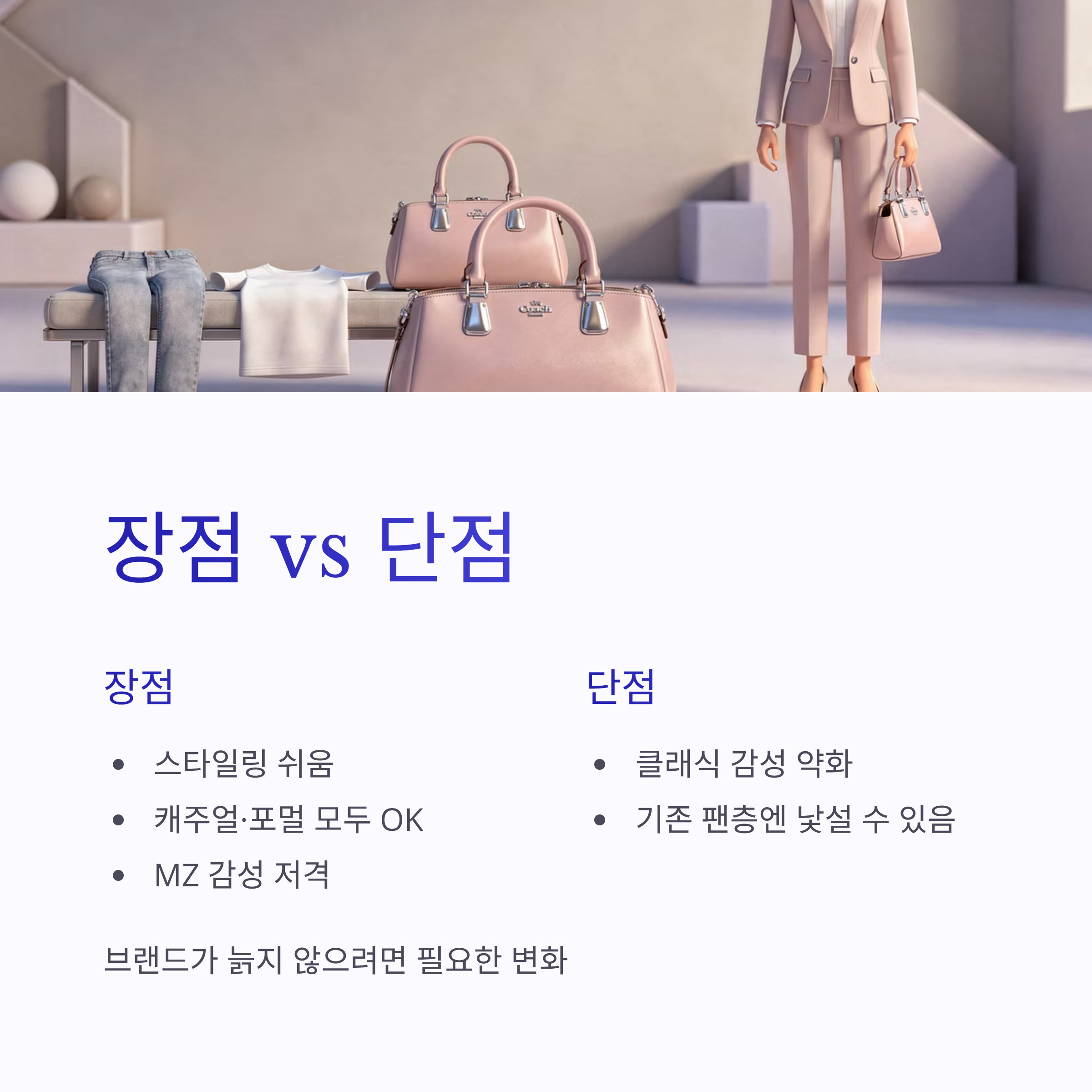 요즘 코치백 디자인 보면 확실히 트렌드가 보여요. 빈티지 무드, Y2K 감성, 짧은 스트랩, 말랑한 가죽… 다 요즘 애들이 좋아할 요소죠. 장점은 확실해요. 스타일링이 쉬워졌고, 캐주얼·포멀 어디든 어울립니다. 반대로 단점이라면, 예전 클래식 코치 감성을 좋아하던 사람들에겐 좀 낯설 수 있다는 점? 그래도 브랜드가 늙지 않으려면 이 정도 변화는 필요했을 것 같아요. 결과적으로 코치백은 ‘세대 교체’에 성공한 케이스라고 봅니다.
