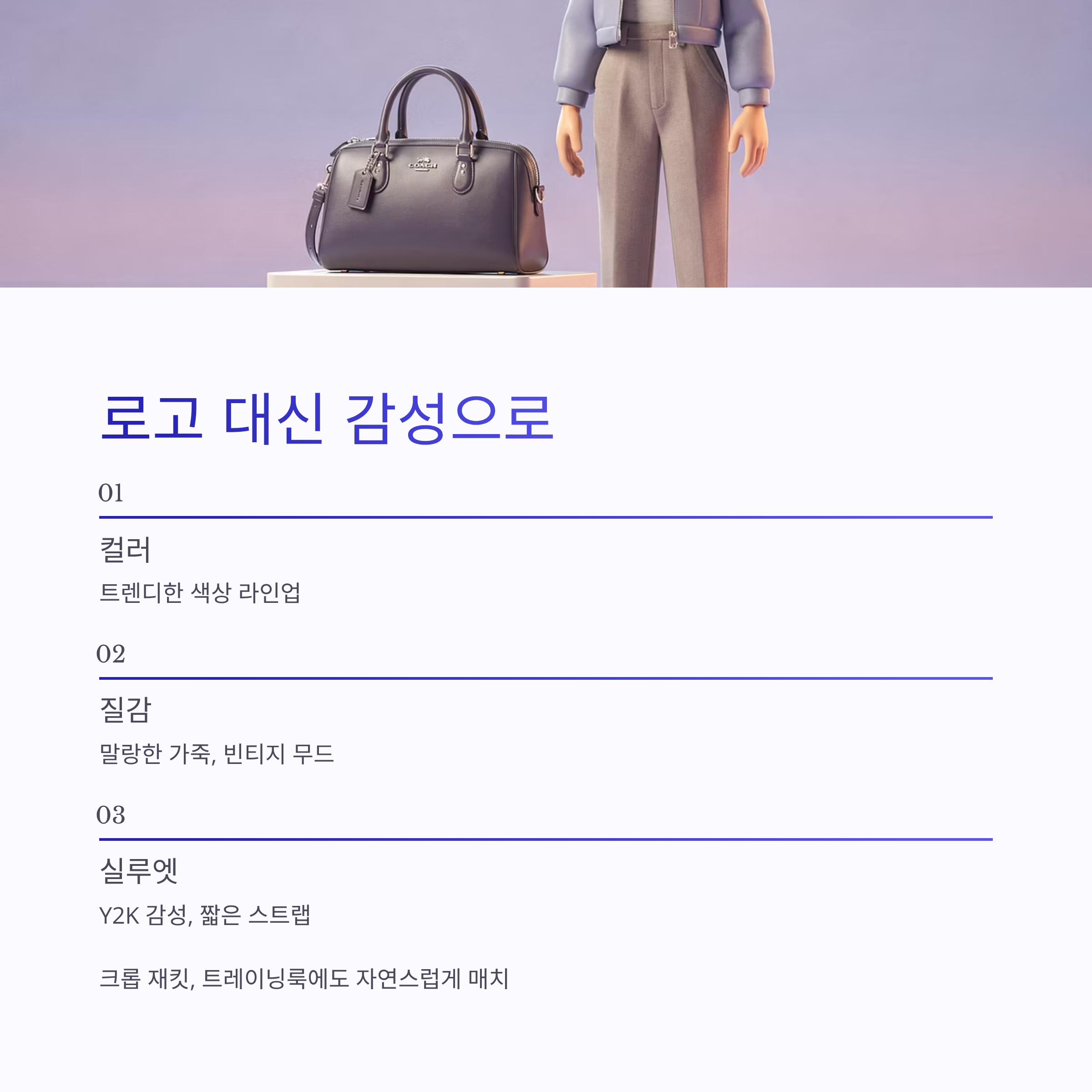 솔직히 몇 년 전까지만 해도 코치백 하면 떠오르는 이미지가 딱 있었잖아요. 엄마 가방, 선물용 가방, 무난한 디자인… 저도 그랬구요. 근데 요즘 길거리나 SNS 보면 분위기가 완전 달라졌습니다. 코치백을 크롭 재킷에 매치하거나, 후줄근한 트레이닝룩에 툭 들고 다니는 모습이 너무 자연스럽더라구요. 저도 처음엔 “어? 이게 코치야?” 싶었는데, 알고 보니 전략이 꽤 치밀했어요. 예전처럼 로고 크게 박는 방식이 아니라, 컬러·질감·실루엣으로 감정을 건드리는 방향으로 바뀌었고, 이게 MZ 감성이랑 묘하게 맞아떨어졌습니다. 코치백이 더 이상 ‘얌전한 가방’이 아니라, 스타일 포인트가 된 느낌이랄까요. 이 변화, 은근히 큽니다 진짜.