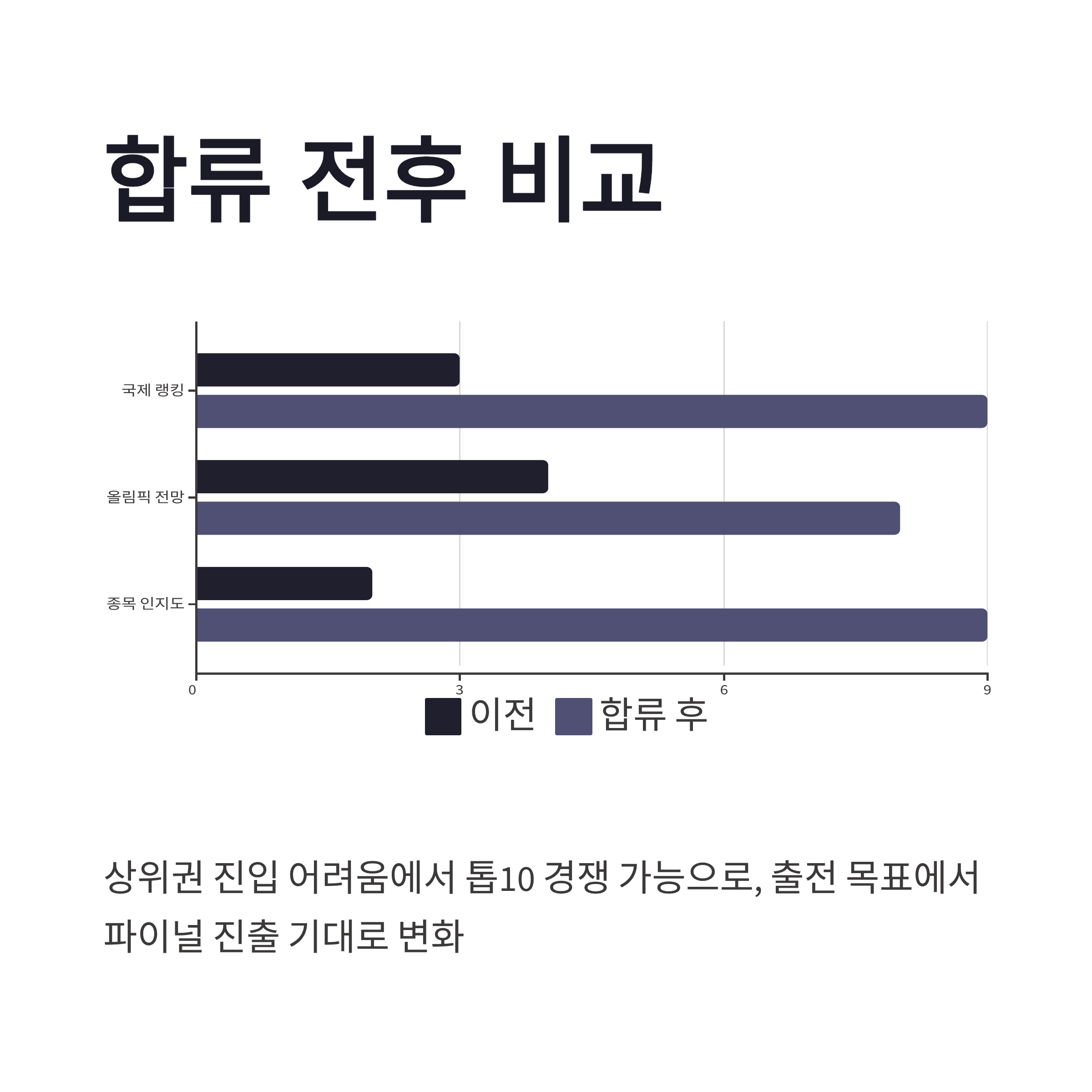| 국제 랭킹 | 상위권 진입 어려움 | 톱10 경쟁 가능 |