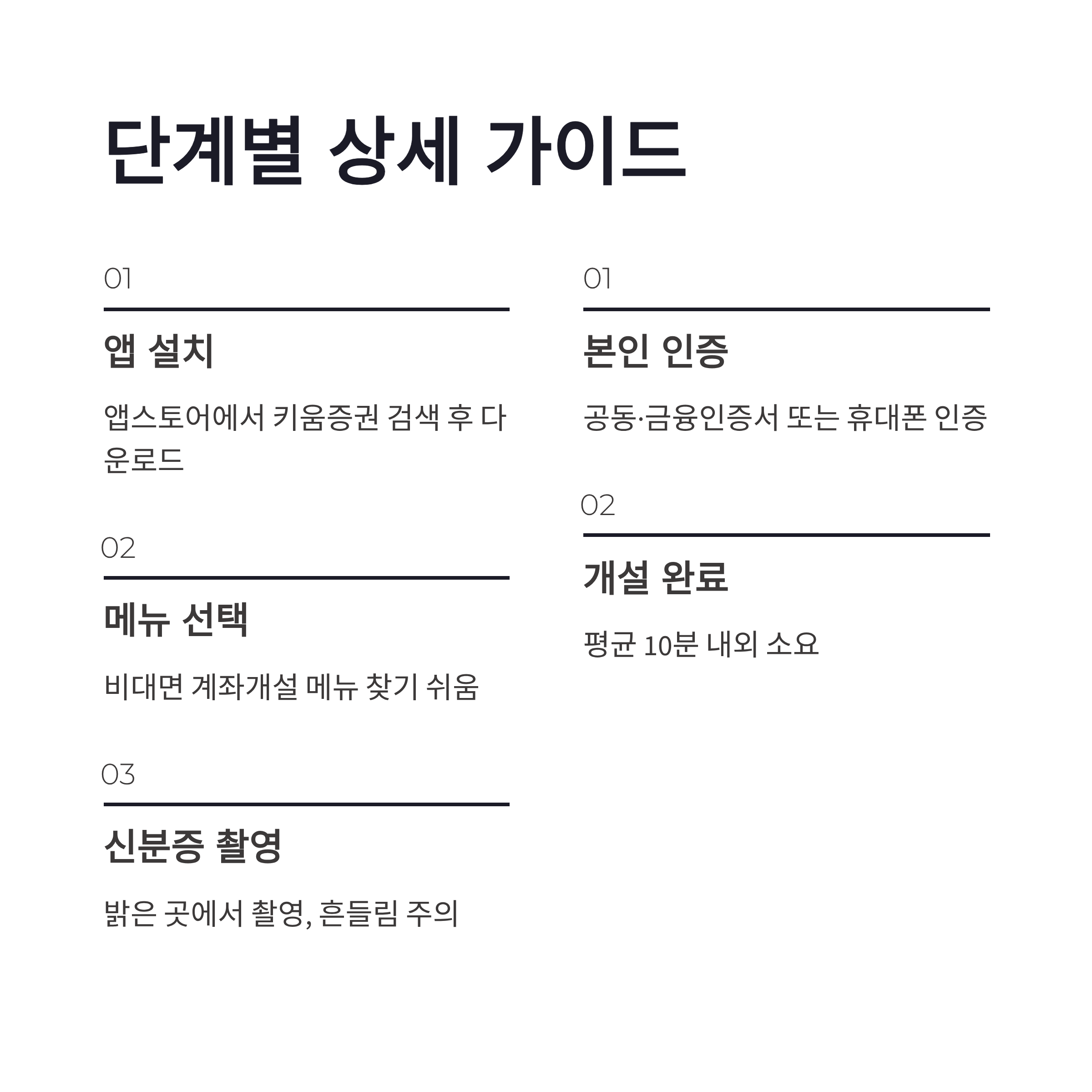 처음엔 저도 중간에 막힐까 봐 걱정했는데, 흐름만 알면 진짜 술술 갑니다. 키움증권 비대면 계좌개설 방법은 아래 순서대로만 하면 끝이에요.