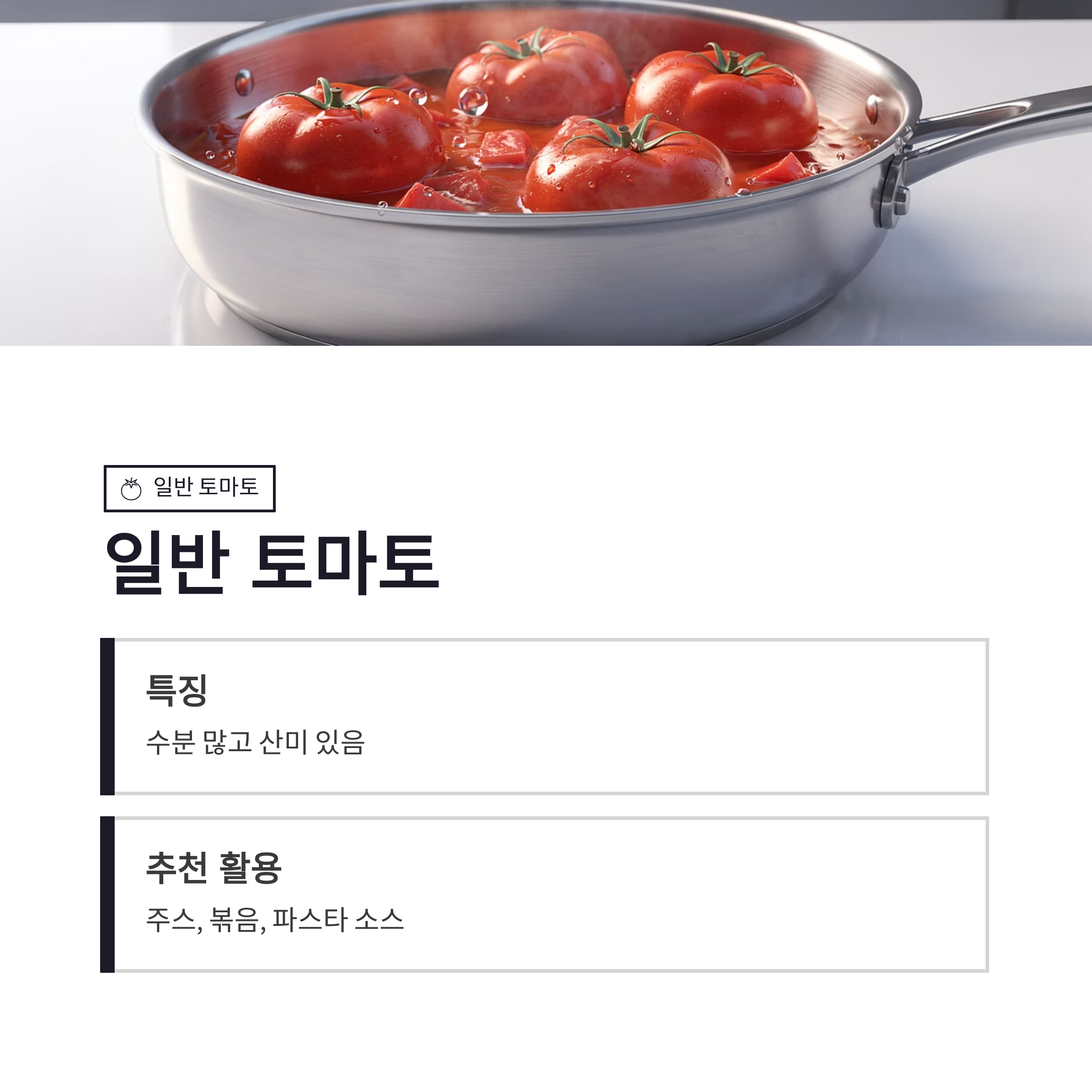 | 일반 토마토 | 수분 많고 산미 있음 | 주스, 볶음 |