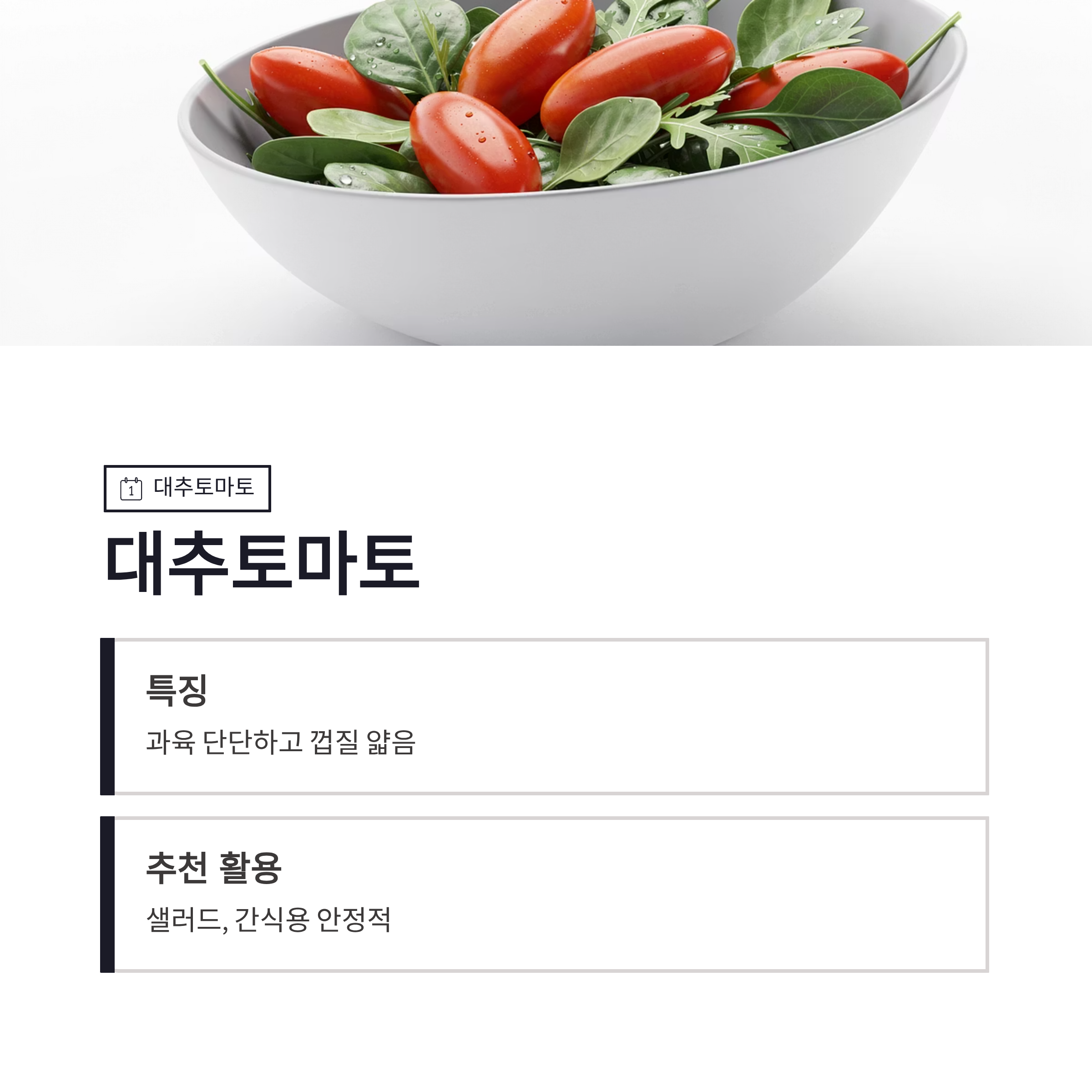 | 대추토마토 | 과육 단단, 껍질 얇음 | 샐러드, 간식 |