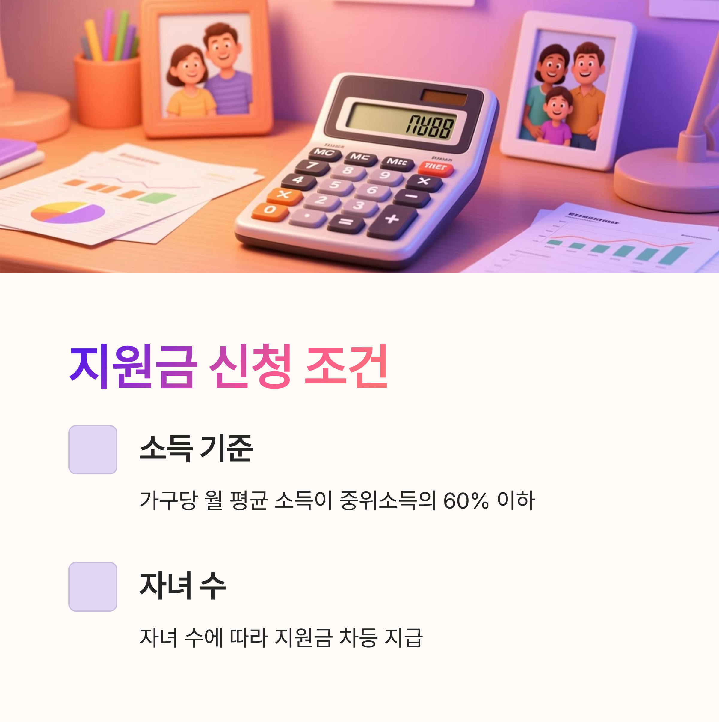 여러분, 지원금 신청 조건이 어떻게 되는지 아시나요? 기본적으로 소득 기준, 자녀 수 등 몇 가지 조건들이 있어요. 다행히도 많~이 어렵진 않아요! 일단 소득 기준은 가구당 월 평균 소득이 중위소득의 60% 이하인 경우 가능합니다.