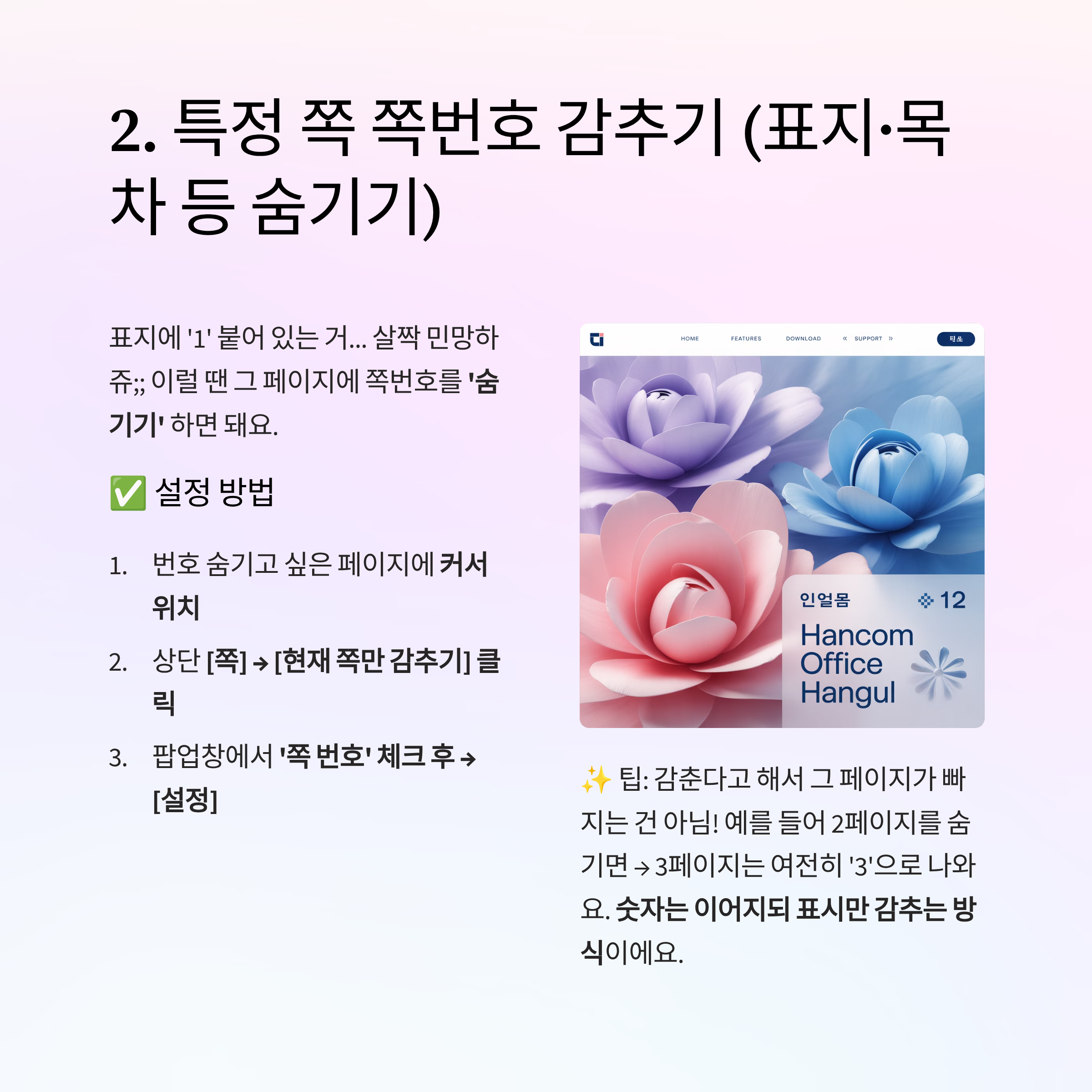 ✨ 팁: 페이지는 숨겨져도 번호 체계는 유지됩니다 (3페이지를 숨겨도 다음은 ‘4’).