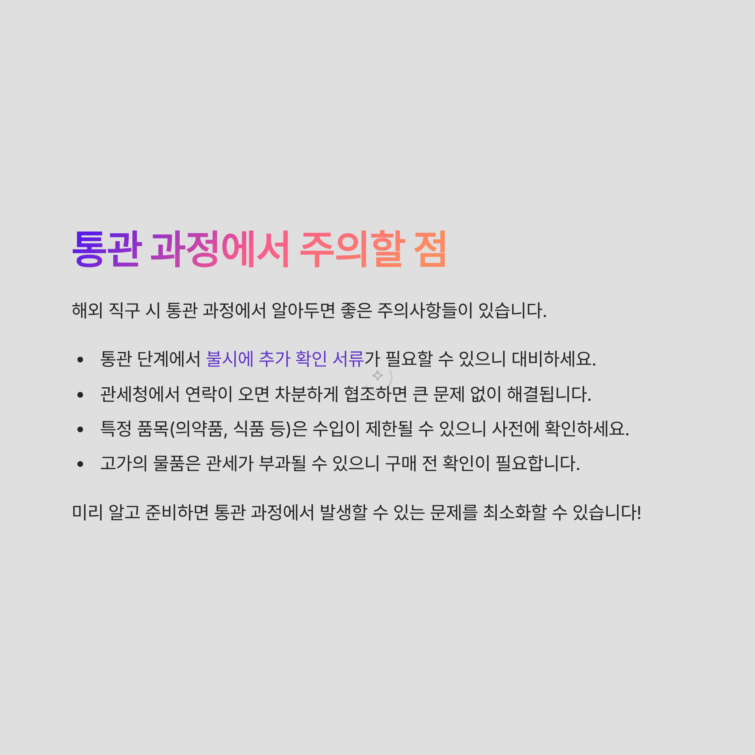 오늘 당장 형광등에 딱! 불 들어오는 느낌으로 시작해봐요! 추가 주문 걱정없이 똑똑하게 관리해보세요. 개인 통관 고유 번호 알고나니 진짜 쉬운 것만 같지 않나요?🤔 해외 직구를 통한 쇼핑의 세계가 이런 소소한 준비만 잘 하면 훨씬 즐겁습니다. 그러니, 오늘 저와 함께 이 모든 단계를 시작해보아요! ✨