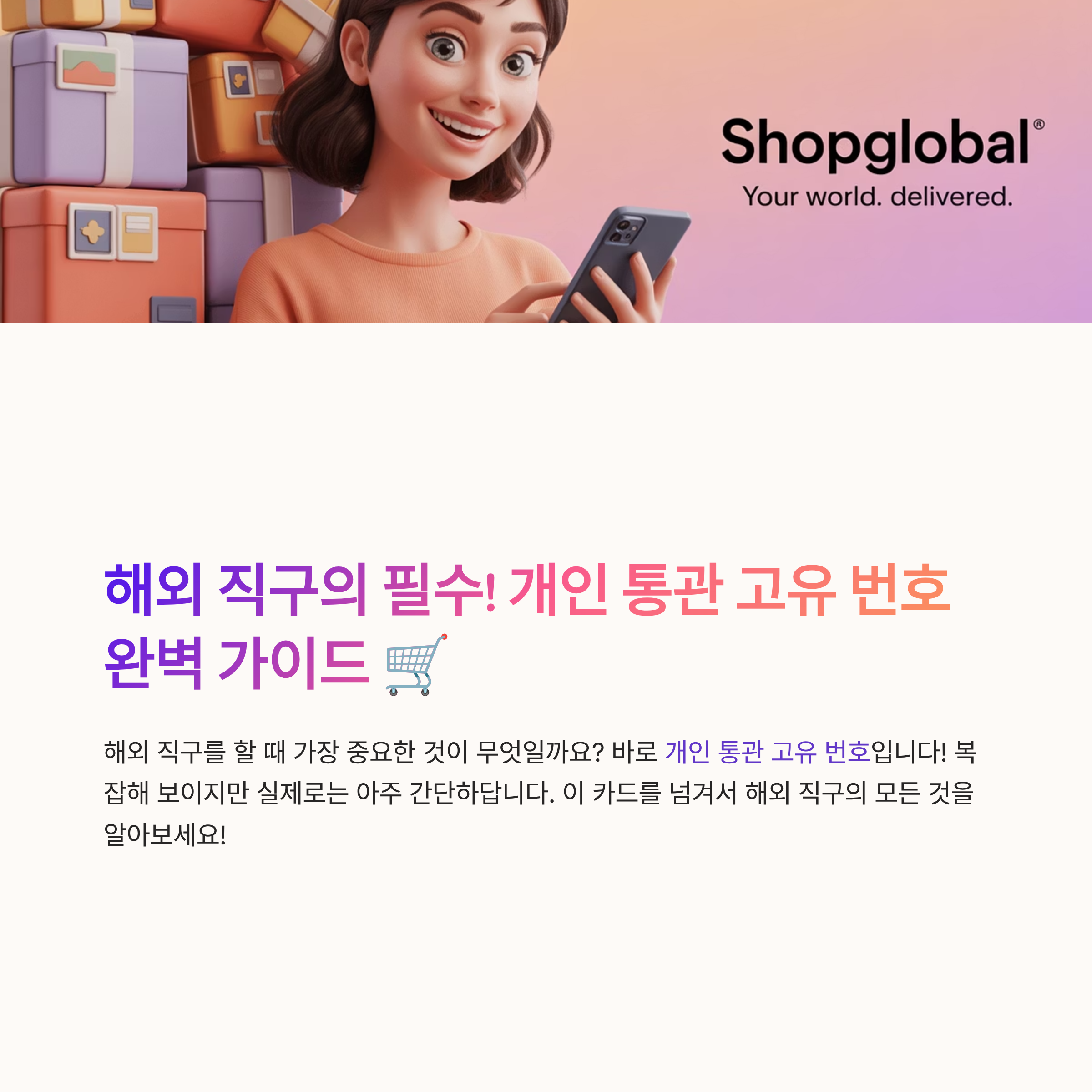 해외 직구! 입이 닳도록 들어보셨죠? 이렇게 멋진 아이템들을 집에서 편하게 누워서 살 수 있는 것도 좋은데요... 근데 이게 그냥 되는 게 아니에요! 개인 통관 고유 번호가 필수랍니다. 왜냐면 요놈이 있어야 물건이 무사히 우리 손에 오거든요😊. 이 번호 없이 해볼라치면 뭘 사든 간에, 통관에서 막혀버리는 대사건이 일어버리죠😱.