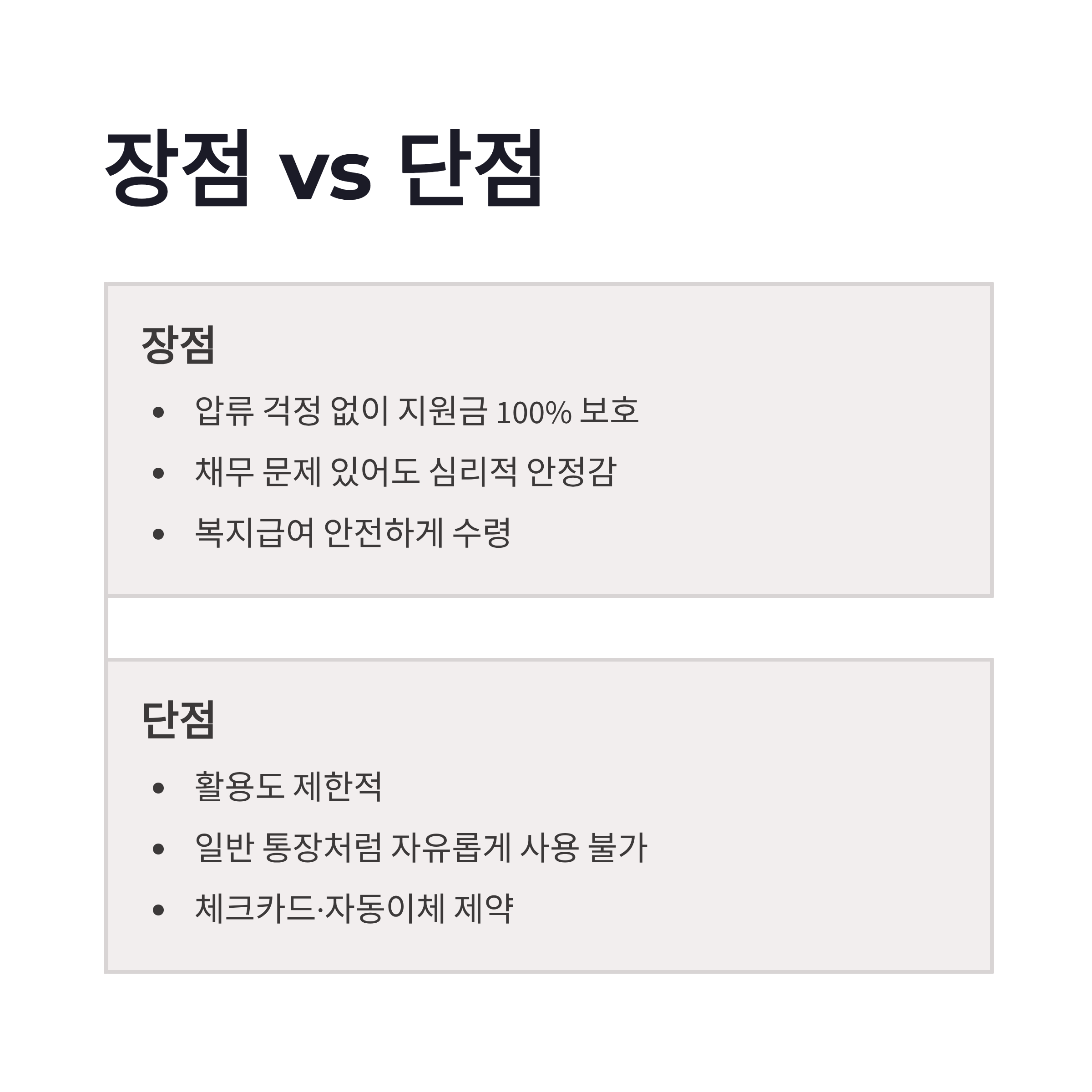 많이 물어보는 게 바로 행복지킴이통장 한도인데요. 2026년 기준으로 월 입금 한도는 약 185만 원 수준이었어요. 기초연금, 장애인연금, 아동수당 등 대부분의 복지급여를 커버하는 금액이긴 합니다. 장점부터 보면, 압류 걱정 없이 지원금 100% 보호된다는 점이 제일 커요. 실제로 채무 문제 있는 분들한테는 심리적 안정감이 꽤 큽니다. 반면 단점은 활용도가 제한적이라는 것. 체크카드 연결이나 자동이체 사용에 제약이 있고, 일반 통장처럼 자유롭게 쓰긴 어렵더라구요. 그래도 “지원금만큼은 지켜야 한다”는 분들에겐 행복지킴이통장이 거의 필수템처럼 느껴졌습니다.